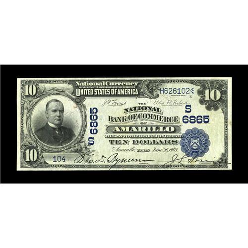 <B>Amarillo, TX</B></I> - $10 1902 Date Back Fr. 616 <B>The NB of Commerce</B></I> Ch. # (S)6865<BR>This is one of only two Date Backs known from this hard to find Amarillo bank, and one with a nice pedigree as well, as it was obtained by our consignor from the Jack Everson collection sale in February of 1997. Bright pen signed <B>Very Fine+++.</B></I><BR><BR><b>Shipping:</b> Coin/Currency (<a target="_blank" href="http://www.heritageauctions.com/common/shipping.php">view shipping information</a>)