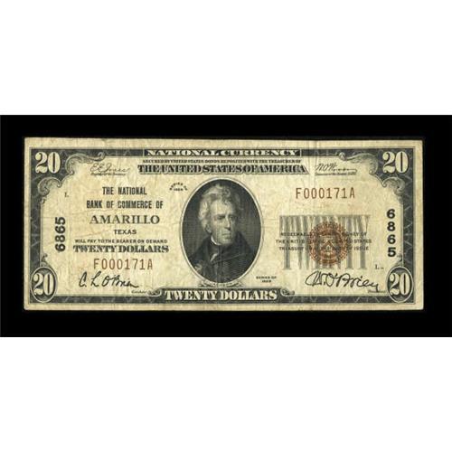<B>Amarillo, TX</B></I> - $20 1929 Ty. 1 <B>The NB of Commerce</B></I> Ch. # 6865<BR> This is a new note for the census that had a population of only 6 small until the arrival of this new note on the numismatic scene. <B>Fine</B></I>.<BR><I>From The Kansas City Collection.</B></I><BR><BR><b>Shipping:</b> Coins & Currency (<a target="_blank" href="http://www.heritageauctions.com/common/shipping.php">view shipping information</a>)