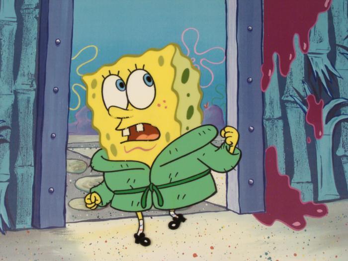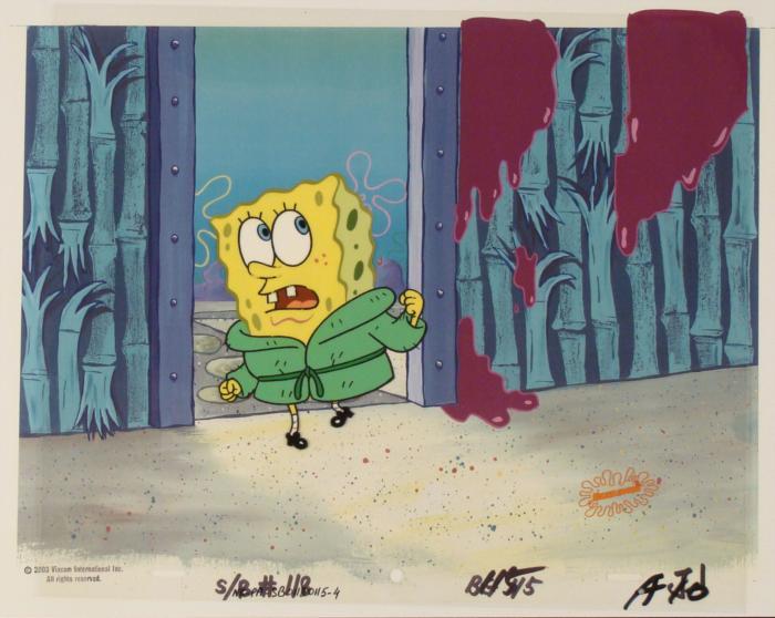 This animation cel and reproduction background are from the Nickelodeon TV show SpongeBob Squarepants. The story takes place under the deep blue sea in Bikini Bottom, where SpongeBob resides. SpongeBob, who is a yellow, porous sponge, is your typical happy-go-lucky character, as he is always cheerful and enjoys making people laugh. Patrick Star, SpongeBob's neighbor who is a starfish, is your average children's show idiot, as he boasts knowing nothing and is often getting himself into ridiculous situations. Between the homes of these two lies the home of the miserable Squidward, a squid, who is known for being grouchy and playing tricks on SpongeBob and Patrick. Both SpongeBob and Squidward work at the Krusty Krab, a fast food business run by the greedy money-loving Mr. Krabs, a crab, the arch rival of the evil, possibly misunderstood, Plankton. Another neighbor, Sandy Cheeks, an athletic squirrel who normally wears an astronaut's space suit, was introduced in "Tea at the Treedome." She spends most of her time inventing and experimenting. SpongeBob is amazed to see his house like this.Original Printed Background and Animated Cel Overall Size of Background: 11" x 17" Overall Size of the Cel: 10 1/2" x 12 1/2" Very good condition This is an original hand-painted cel set-up used in the production of an episode of "SpongeBob SquarePants." Each one-of-a-kind set-up represents a slight change in position of the characters. When individually photographed and projected in rapid succession, the images appear to move.
