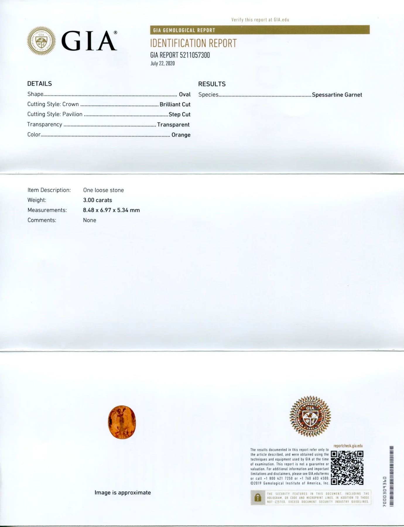 Beautiful 3.00 Ct Vivid Fanta Orange Garnet measuring 8.48 x 6.97 x 5.34 mm with a brilliant oval cut. Displays a gorgeous and bright, orange hue with strong saturation. Do not miss this one!!! Origin: Nigeria. Treatment: None. Please see the certification for additional information.