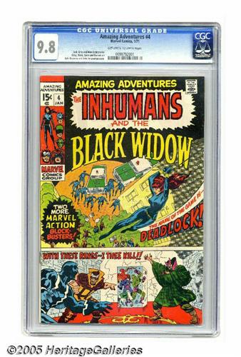 <B>Amazing Adventures #4 (Marvel, 1971) CGC NM/MT 9.8 Off-white to white pages.</B></I> The busy, Marvel-ously bombastic cover is by John Buscema. Inside, the venerable trio of Jack Kirby, Gene Colan, and Bill Everett contribute story art. All cool enough stuff, but this relatively modest Bronze Age issue becomes much more <I>interesting</B></I> in this super-high grade. CGC has not certified a higher grade for this issue to date. Overstreet 2005 NM- 9.2 value = $32. CGC census 6/05: 5 in 9.8, none higher.
