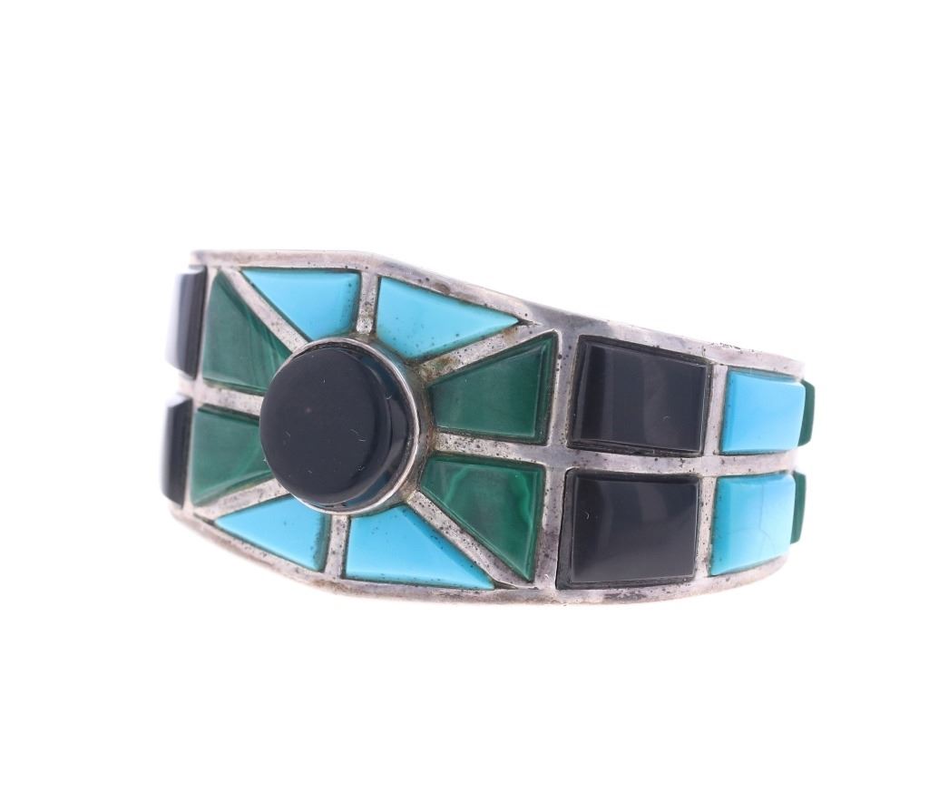 This is truly an outstanding, art piece sterling silver cuff bracelet with stained glass window pattern in turquoise, malachite and black onyx dating to the 1990's from a Navajo silversmith. The bracelet features a wonderfully and professionally crafted sterling silver, turquoise, malachite, and onyx construction that shows an inlaid design with triangular and square cabochon set like a stain glass window and shows a round onyx cabochon set in the center. The bracelet is marked sterling on the underside of the bracelet. The condition of this Navajo bracelet is good with a slight patina to the bracelet but otherwise shows good overall condition. The measurements of this bracelet is 2" x 2 1/2" x 1 1/4" and the circumference is 4 1/2". The collective weight of this bracelet is 64.3g.