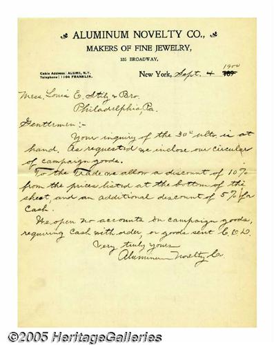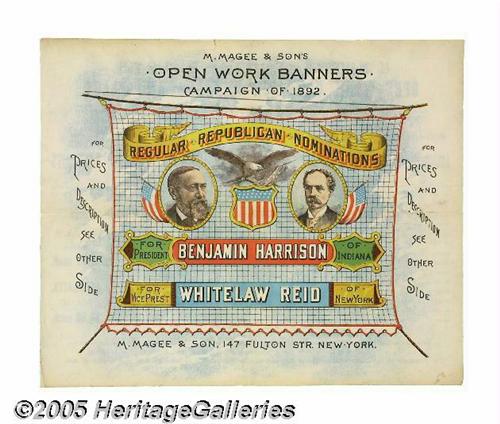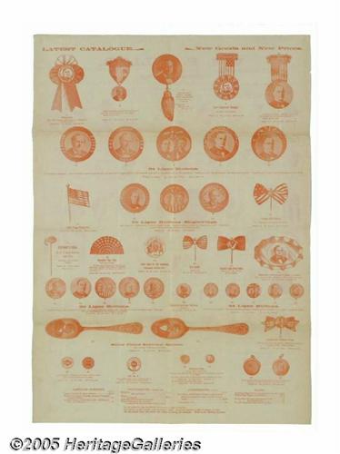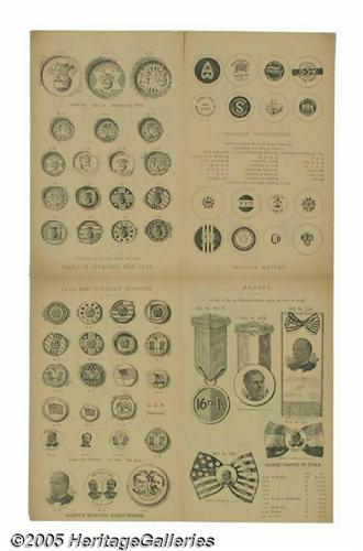 <B>Amazing Collection of Advertising Flyers for Early Political Items</B></I> These advertising brochures are very popular with collectors, and this is the most interesting and diverse group we have ever seen in one place! Thirty different items, each professionally shrink-wrapped. Sizes from 5" to 24". Please note that <I>none</B></I> of these is an ad cut from a newspaper or magazine; these are all actual manufacturer's literature. We cannot possibly list these in adequate detail, but here are some highlights: Large Ohio Cutlery brochure with picturing Cleveland - Stevenson jugate and McKinley for Senator knives, and many others; multicolor 18" x 14" poster for Harrison-Reid street banners (we have seen this style for other tickets, but not for this one. Alone easily a $300-500 item); large F. W. Miller flyer picturing Bryan mechanical skeleton, Teddy Roosevelt open-mouth mechanical, and many other great items, some of which we have never seen "in person"; large 1896 flyer picturing several dozen familiar button designs; huge, poster-size foldout Miller flyer with numerous 1900 button designs and other types of items; large Aluminum Novelty Co. broadside with McKinley and Bryan match safes, unusual mechanical pins, and more; great W. Coates flyer for "The McKinley Tin Napoleon Hat" with image of McKinley wearing one!; William H. Horstmann flyer for parade uniforms, including McKinley and Bryan belts; Apple and Co. flyer for parade headgear, including caps and helmets with candidate names and portraits (one has a brass-framed McKinley - Hobart jugate as an emblem, permanently settling the discussion over the intended use of this item, pictured as McKinley-1 on page 14 of Hake's 1896-1972 book; a multi-page, bold red, white and blue booklet for political parade uniforms and gear from United States Campaign Equipment Manufacturing Co.; flyer with large illustrations of 3-D coffins containing McKinley and Bryan images; Cuban Revolution patriotic items; and so much more! All in great condition. An instant collection of this desirable subject matter! See our web site for complete photo listing. Lot:260
