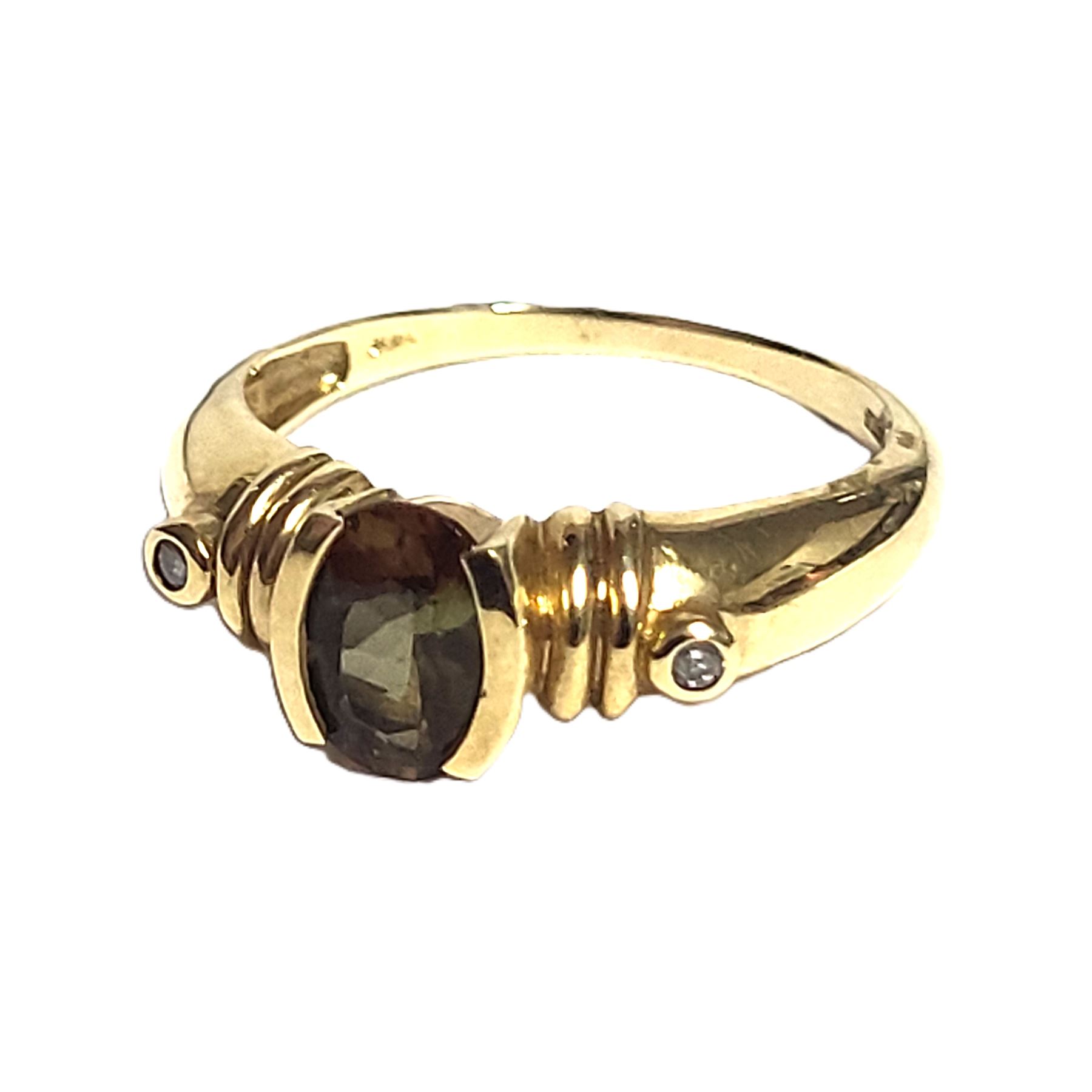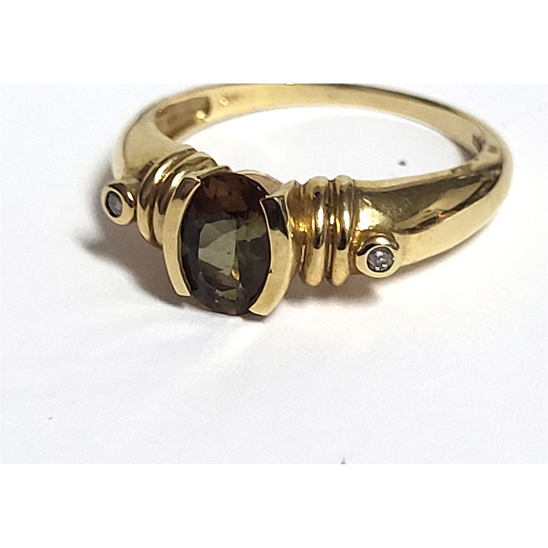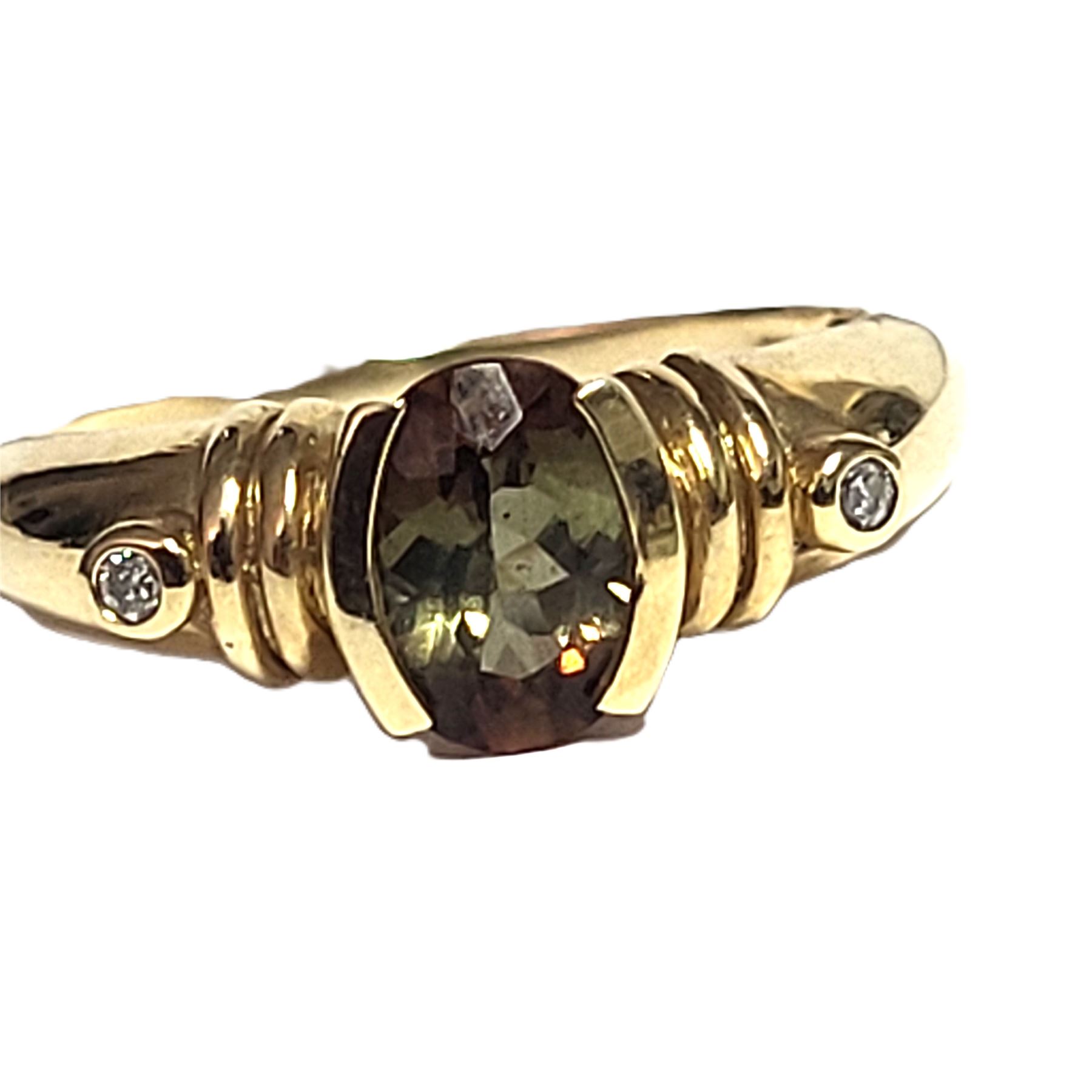 This is a 14 karat yellow gold ring that features an approximate 1.10 carat oval-cut Andalusite that is accented by approximately .04 carats total weight of round, brilliant-cut, H color, SI2 clarity diamonds.& nbsp; The Andalusite is half-bezel set& nbsp; with domed, ribbed shoulders that taper to an approximate& nbsp; & nbsp;1.5mm knife-edge shank.& nbsp; The ring is US size 9 and and can be sized for an additional charge. This ring is eligible for appraisal at a discounted rate, from an independent appraiser (with qualifying credentials from GIA) with no affiliation to Bidfair Fine Jewelry. Please contact Bidfair Fine Jewelry for more information on appraisals and sizing.