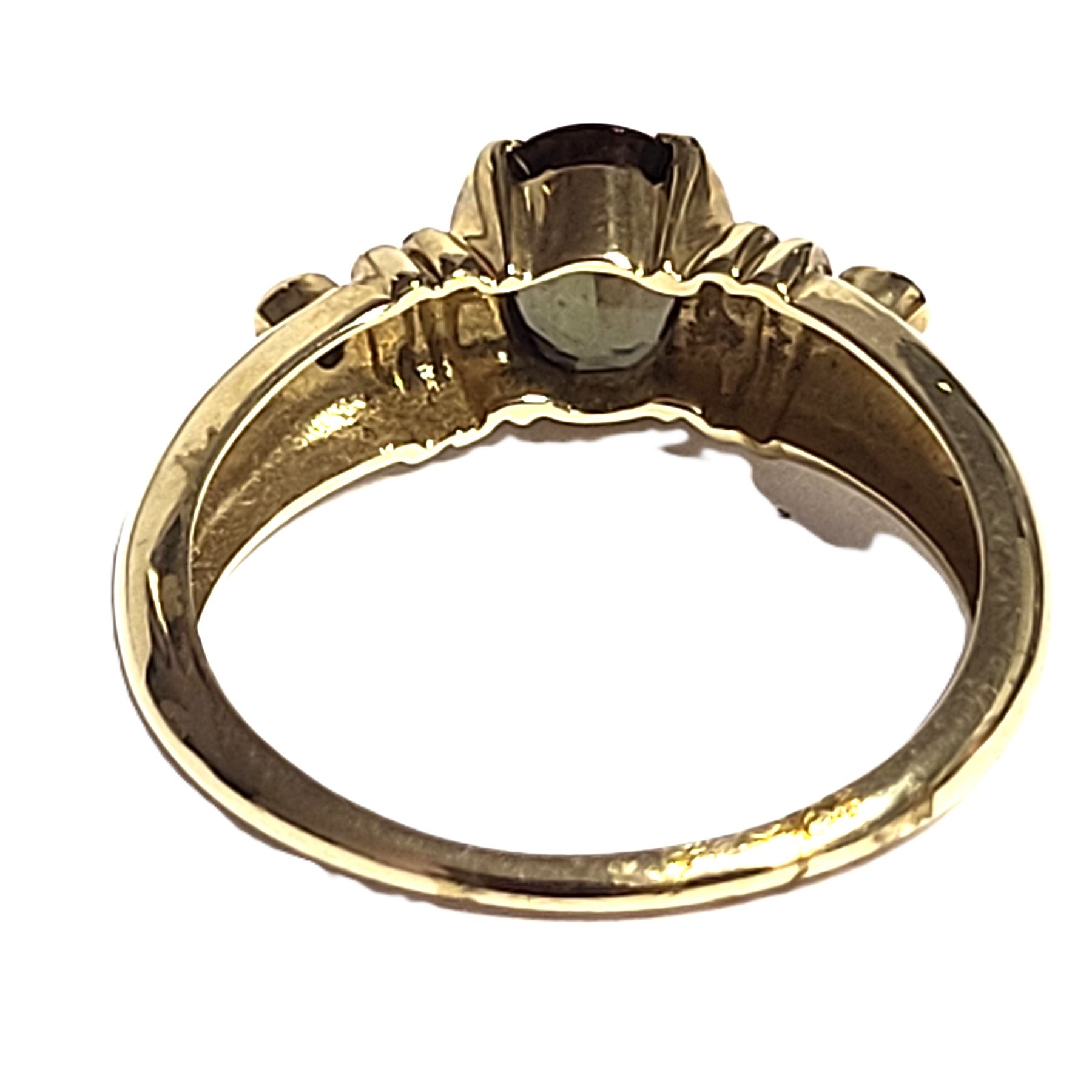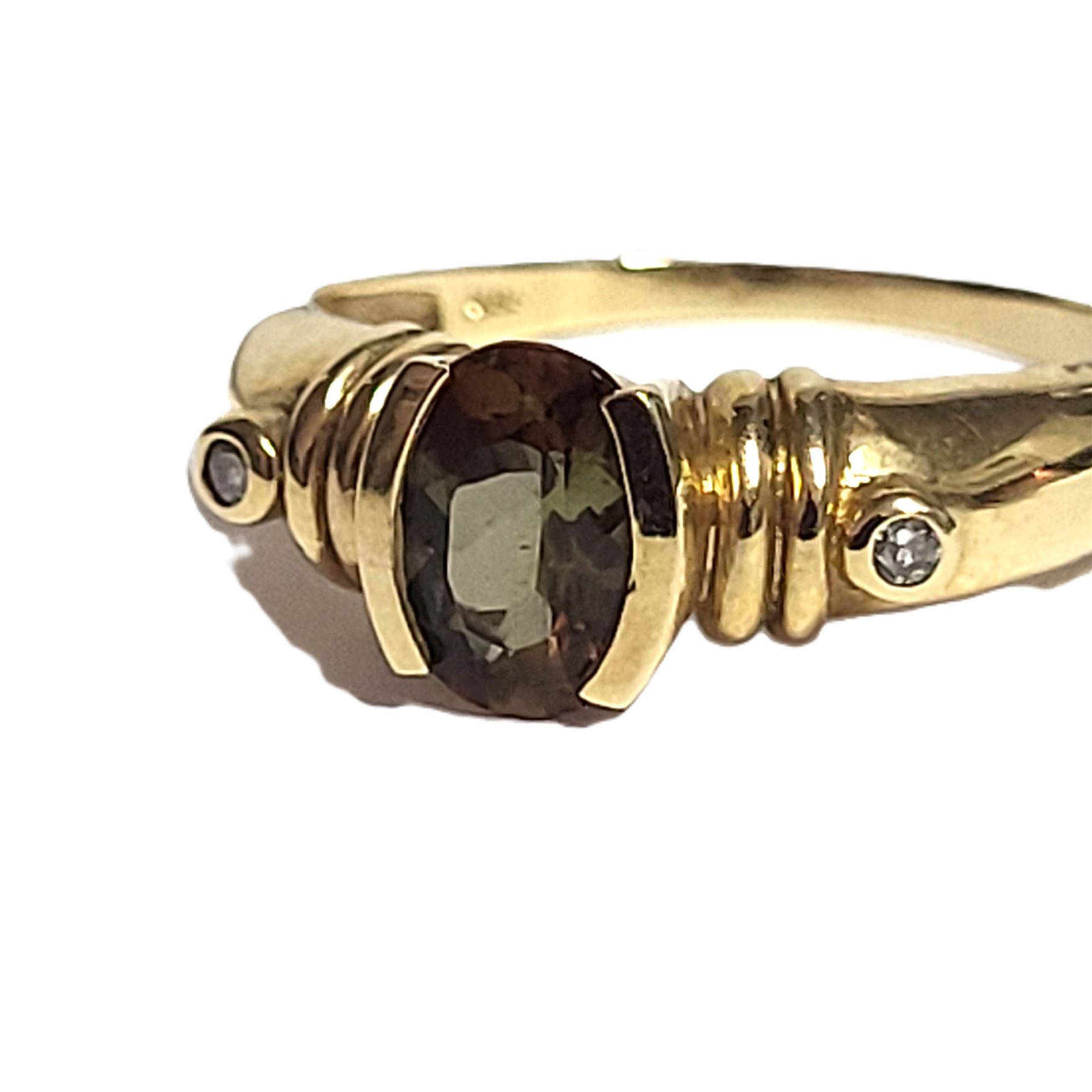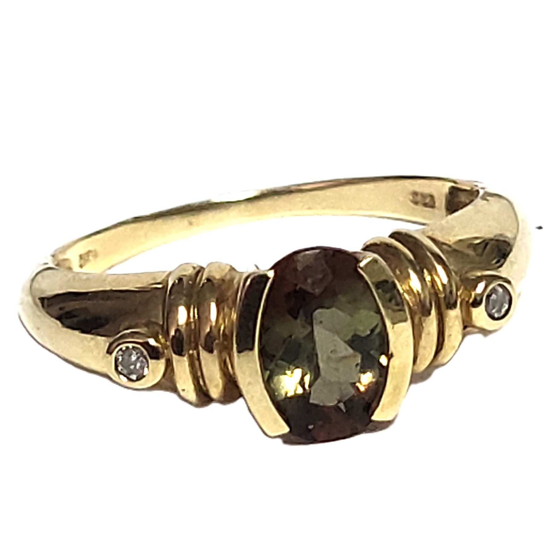 This is a 14 karat yellow gold ring that features an approximate 1.10 carat oval-cut Andalusite that is accented by approximately .04 carats total weight of round, brilliant-cut, H color, SI2 clarity diamonds.& nbsp; The Andalusite is half-bezel set& nbsp; with domed, ribbed shoulders that taper to an approximate& nbsp; & nbsp;1.5mm knife-edge shank.& nbsp; The ring is US size 9 and and can be sized for an additional charge. This ring is eligible for appraisal at a discounted rate, from an independent appraiser (with qualifying credentials from GIA) with no affiliation to Bidfair Fine Jewelry. Please contact Bidfair Fine Jewelry for more information on appraisals and sizing.