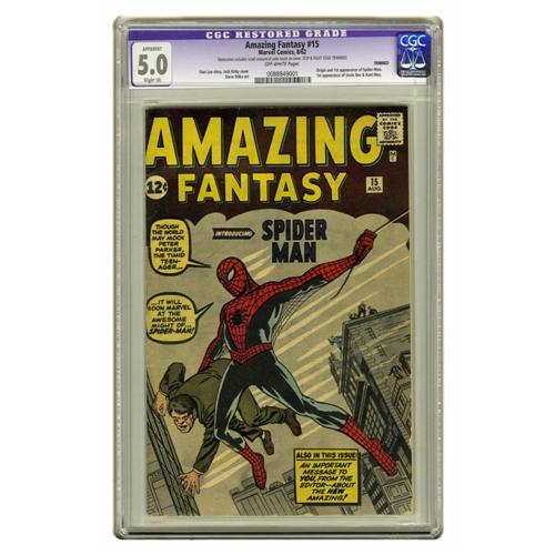 <B>Amazing Fantasy #15 (Marvel, 1962) CGC Apparent VG/FN 5.0 Slight (A) Off-white pages.</B></I> This historic issue boasts the origin and first appearances of Spider-Man, Uncle Ben, and Aunt May. The cover is by Jack Kirby, and the interior art by Steve Ditko. CGC notes, "Restoration includes: small amount of color touch on cover. (Top and right edge trimmed.)" Overstreet 2006 GD 2.0 value = $1,500; VG 4.0 value = $3,000; FN 6.0 value = $4,500. <BR><BR><B>Important notice:</B> Heritage usually auctions material at the rate of 200-250 lots per hour. On some occasions eBay Live bid software or the Internet may not be able to keep up with the pace of the auction. We recommend placing a realistic absentee bid now as insurance to avoid disappointment. Occasionally the auctioneer may eliminate or reject an eBay Live bid, and the auctioneer may also reopen a lot after the close of the eBay live bidding (usually because we missed an audience bid), and may reject your bid even if it shows you as the winning bidder. By bidding via eBay Live, you agree that Heritage may award the lot to another bidder at its sole discretion under the circumstances described above or any other reasonable circumstances. Since eBay bids are not shown to us until we open the lot on the floor, we treat those bids just like floor bids. In most cases the floor responds before the eBay bid is presented to us, due to Internet lag time, so for consistency we have made it a policy that floor bids are always considered first over tie eBay live bids. Also please note that all Heritage lots purchased through eBay Live carry a 22.5% Buyer's Premium. Please make sure you read the Terms and Conditions before you bid. This lot is being auctioned in conjunction with a live floor auction by Heritage Auction Galleries. All final auction and invoice information will be supplied by Heritage Auction Galleries, and all other information should be considered preliminary. Lot:41001 <BR><BR><B>Winning Notification and Billing:</B> After the FINAL session in this auction is complete, Heritage will send e-mail and snail mail invoices. This process normally takes several days. All final auction and invoice information will be supplied by Heritage Auction Galleries, and all other information should be considered preliminary. <BR><BR>This auction will be conducted on a live auction floor and over the Internet through eBay Live. If you choose to place an absentee bid, please take a moment to <font color='#0000ff'><u><a href='http://pages.ebay.com/liveauctions/help/before/laabsentee.html'>learn how eBay Live absentee bidding works</a></u></font><font color='#000000'>