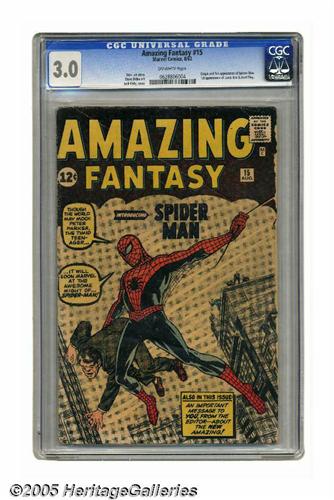 <B>Amazing Fantasy #15 (Marvel, 1962) CGC GD/VG 3.0 Off-white pages.</B></I> It all starts here, true believers: the origin and first appearance of your favorite wall crawler, Spider-Man. Oh yeah, Uncle Ben (poor guy) and Aunt May co-star with young Peter Parker, your friendly neighborhood... you know. Jack Kirby kicks it off with a cover illustration, Steve Ditko provides the story art, and the rest is, as they say, history. Overstreet 2005 GD 2.0 value = $1,400; VG 4.0 value = $2,800. CGC census 7/05: 43 in 3.0, 205 higher.