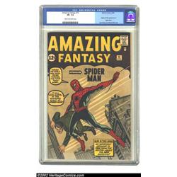 Amazing Fantasy #15 (Marvel, 1962) CGC VF- 7.5 Cream to off-white pages. It's ranked #1 in value among all Silver Age books, this presentation of Spider-Man's origin and first appearance. It hasn't always been thus. For years Showcase #4, now regarded as the book that launched the Silver Age, was ranked #1. Marvel's first serious foray came with Fantastic Four, but the first issue of that run has been overtaken and left in the wake of Amazing Fantasy #15. One of the few Marvel "premier" books of the early 1960s not drawn by Jack Kirby, Steve Ditko deservedly got the call and proceeded to create the classic Spider-Man look for the first three years of the title's run. This nice copy, while displaying enough minor stresses to keep it from challenging in the Near Mint range, still ranks within the top 15% of all copies of the landmark issue that CGC has graded to date. Overstreet 2002 VF 8.0 value = $13,200. Important notice: We expect to be auctioning lots at the rate of 200-250 per hour. Sometimes eBay Premier live bid software cannot keep up with that pace, so we strongly recommend that you place a realistic proxy bid now as insurance to avoid disappointment. Also please note that all Heritage/CAA lots purchased through eBay Premier carry a 20% Buyer's Premium. Please make sure you read the Terms and Conditions.