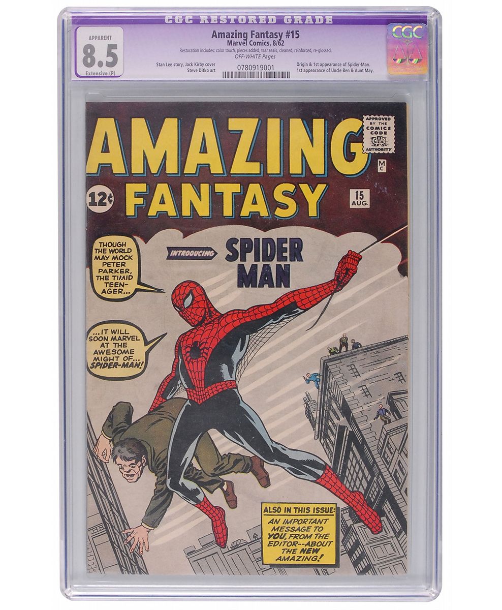Amazing Fantasy #15 (Marvel, 1962) CGC Apparent VF+ 8.5 Extensive (P) Off-white pages. The origin and first appearance of Spider-Man (Peter Parker) and the first appearances of Uncle Ben and Aunt May. Jack Kirby and Steve Ditko cover and art. CGC notes, "Restoration includes: color touch, pieces added, tear seals, cleaned, reinforced, re-glossed." A desirable offering of the debut of one of marvel’s best-known characters.
