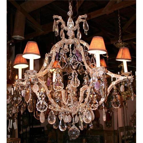 This Amazing Antique French Iron Six Light Chandelier is in Excellent Condition,c1880. It has been completely revamped with powder coating, rock , clear, amethyst crystals, lamp shades and re-wiring. Measuring 49" x 45" it is Fantastic for Numerous Designs. Please view the numerous pictures, serious inquiries are welcome!