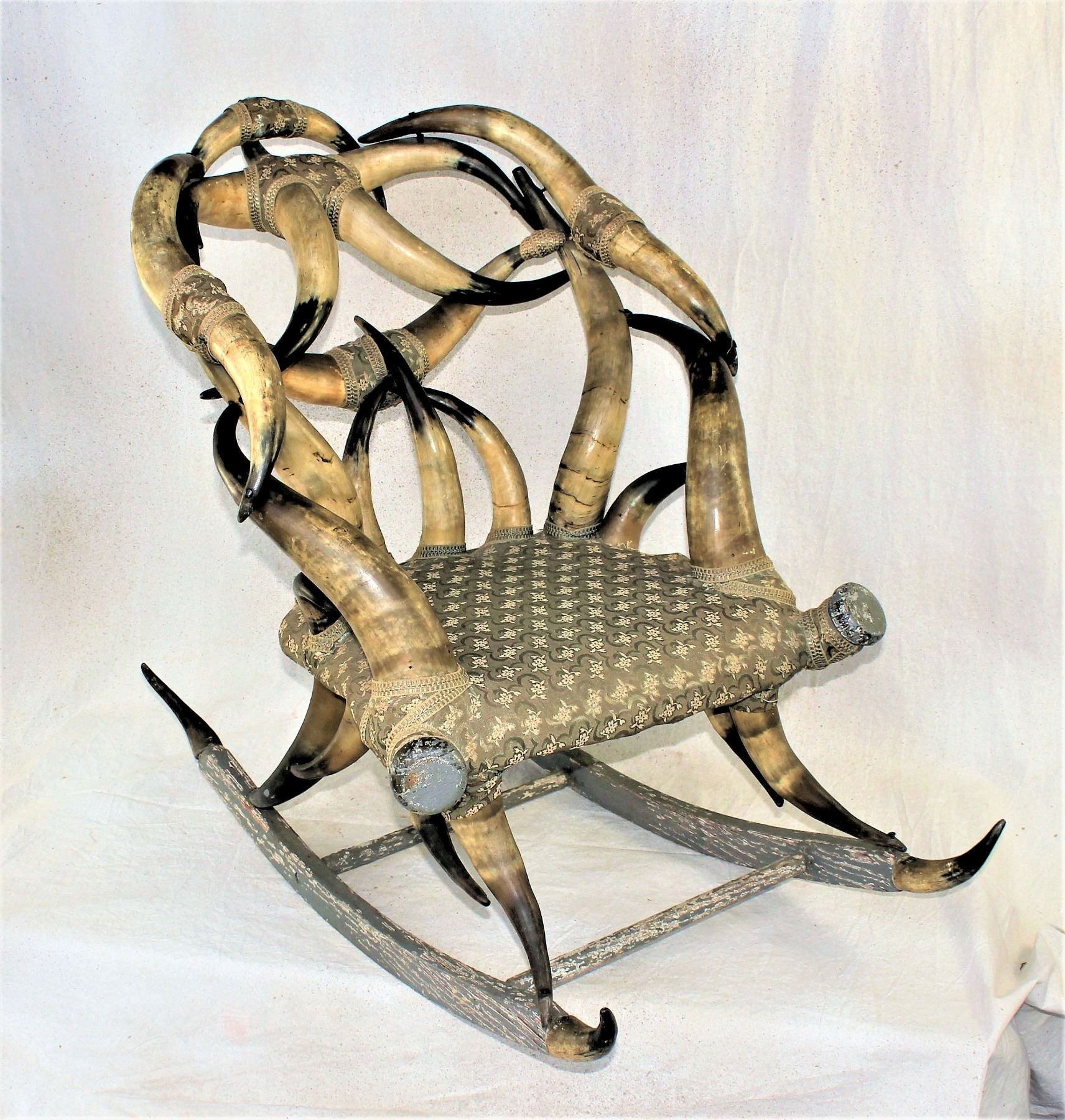 Incredible horn rocker shows wonderful patina, and desirable originality. Made using more horns than we normally see and maintaining its original attractive upholstery.