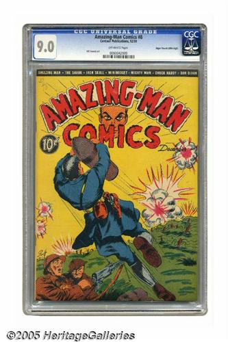 <B>Amazing-Man Comics #8 Mile High pedigree (Centaur, 1939) CGC VF/NM 9.0 Off-white pages.</B></I> Comic books from Centaur Publications continue to command great interest among Golden Age collectors, and this fine specimen shows you why. The most renowned of all pedigrees provides this stunning copy, the only copy of #8 to be certified by CGC as of this writing. It's doubtful there's a nicer specimen in existence of this issue that Gerber rates "uncommon." Bill Everett provided the cover art here, and some interior art as well, barely one month after he introduced his most famous character, the Sub-Mariner, in <B>Marvel Comics</B></I> #1. There's also art by Carl Burgos and Lew Glanzman. Overstreet notes that Cat-Man dresses as a woman in the issue... make of that what you will! Overstreet 2005 VF/NM 9.0 value = $1,703; NM- 9.2 value = $2,300. CGC census 6/05: 1 in 9.0, none higher.