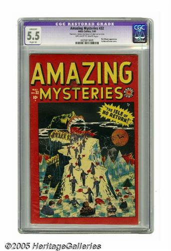 <B>Amazing Mysteries #32 (Marvel, 1949) CGC Apparent FN- 5.5 Slight (A) Off-white to white pages.</B></I> Considered the first Marvel horror comic, this first issue of the title continued the numbering from <B>Sub-Mariner Comics</B></I> #31. It's a shame about the slight bit of color touch here - so slight, it should have just been left alone. CGC notes, "Restoration includes: small amount of color touch on cover." Overstreet 2005 GD 2.0 value = $83; VG 4.0 value = $166; FN 6.0 value = $249.