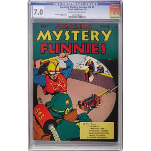 <B>Amazing Mystery Funnies V2#3 (Centaur, 1939) CGC FN/VF 7.0 Cream to off-white pages.</B></I> Air-Sub DX by Carl Burgos begins; Bill Everett provided the cover. This copy, the first to be offered in a Heritage sale, is currently the only unrestored example on the CGC census; however, CGC does note, "Very minor amount of color touch on cover." Overstreet 2007 FN 6.0 value = $237; VF 8.0 value = $494. CGC census 6/07: 1 in 7.0, none higher.<BR><BR><b>Shipping:</b> Comics - Slabbed (certified) (<a target="_blank" href="http://www.heritageauctions.com/common/shipping.php">view shipping information</a>)