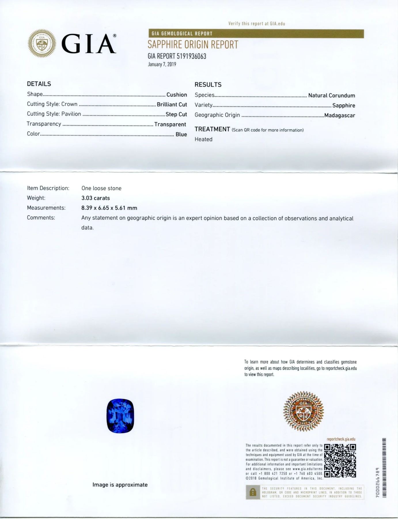 Breathtaking VVS1 Eye Clean 3.03 Ct Cornflower Blue Sapphire is a Brilliant Cushion Cut measuring 8.39 x 6.65 x 5.61 mm. This Gorgeous Gem displays a strong blue hue and saturation. Don't miss this one! Origin: Madagascar. Treatment: Heat Only. Please see the certification for additional information.
