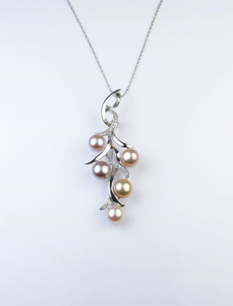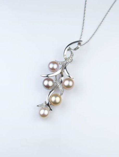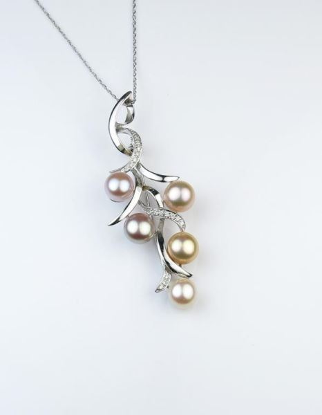 Features five high quality round cultured pearls and side diamonds set in an intricate designer made setting in 14K white gold.