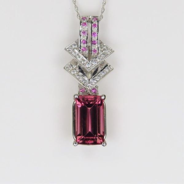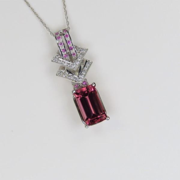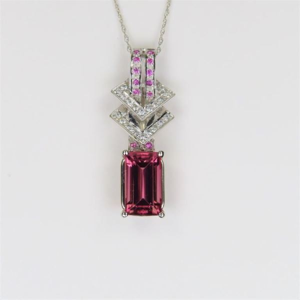 Amazing Pink Tourmaline and Diamond Pendant featuring an emerald cut Pink Tourmaline weighing approx. 4.00 carats accented with 12 Pink Sapphires and 24 Diamonds set in a stylish setting crafted in 14 karat gold.