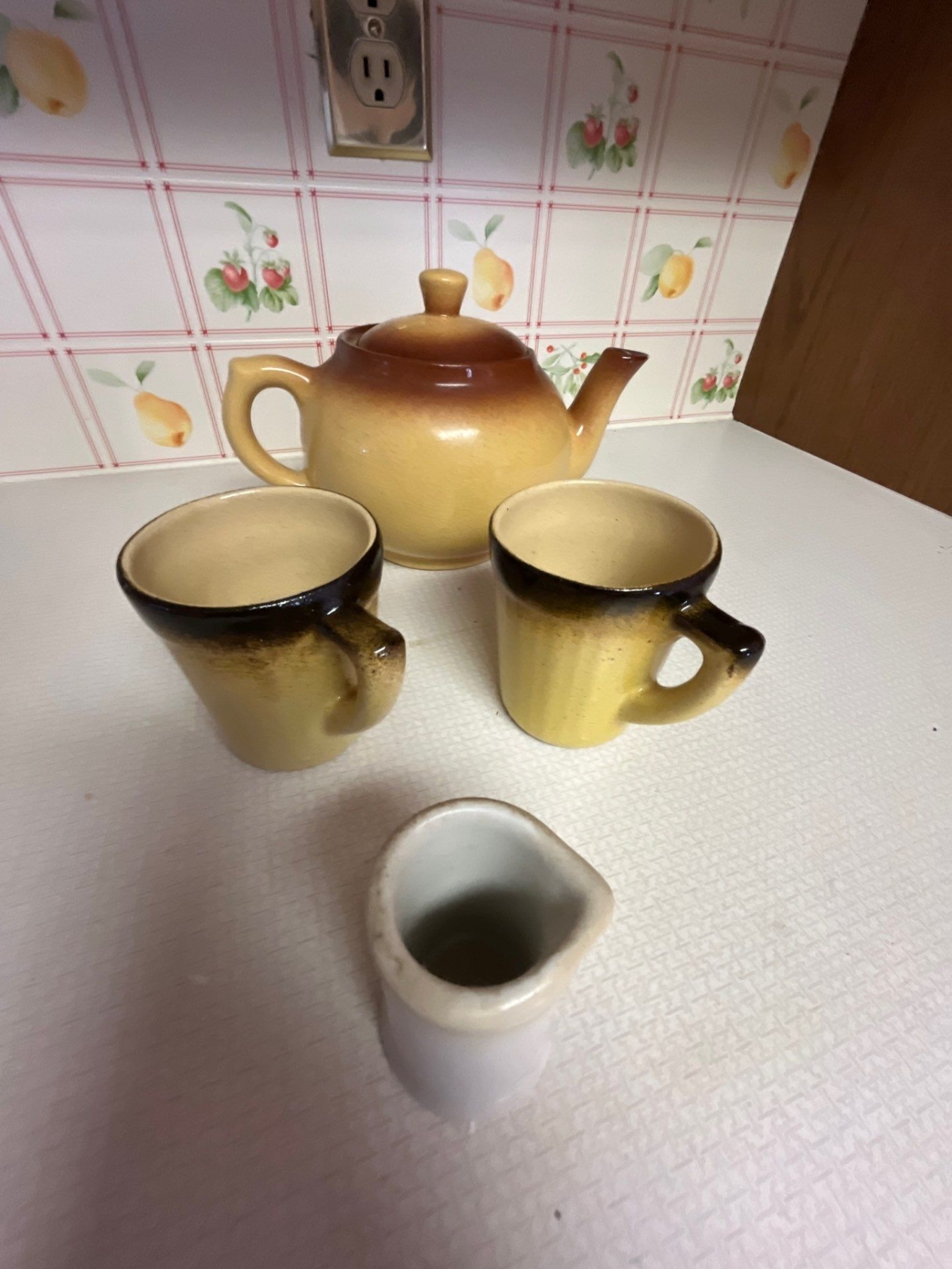 Amazing Rare Medelta Tea Pot and coffee cups with small cream container this set is great for any pottery collection .