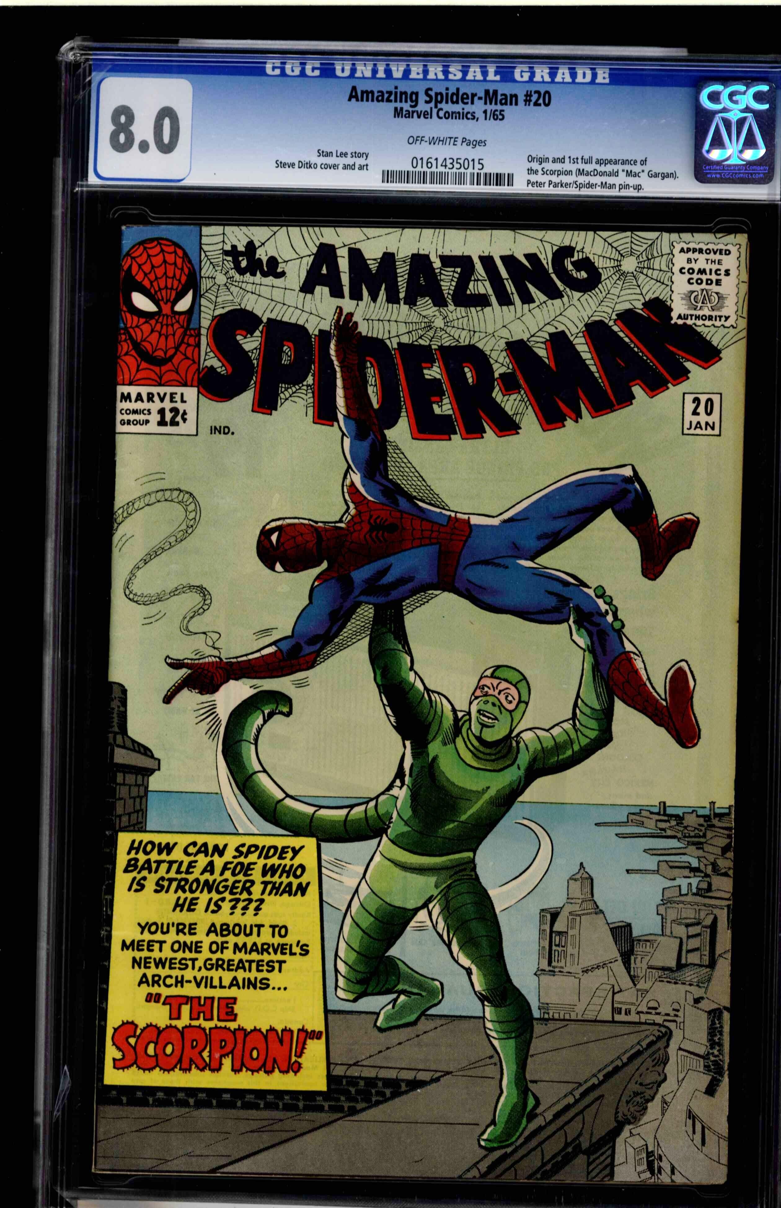 Amazing Spider-Man #20 CGC 8.0 off-white pages. "The Scorpion" first appearance of the Scorpion. Written by Stan Lee, art by Steve Ditko. January 1965. Origin and 1st full appearance of the Scorpion (MacDonald "Mac" Gargan). Peter Parker/Spider-Man pin-up. Overstreet 2009 VF 8.0 value = $485. CGC census: 75 at 8.0, 146 higher.