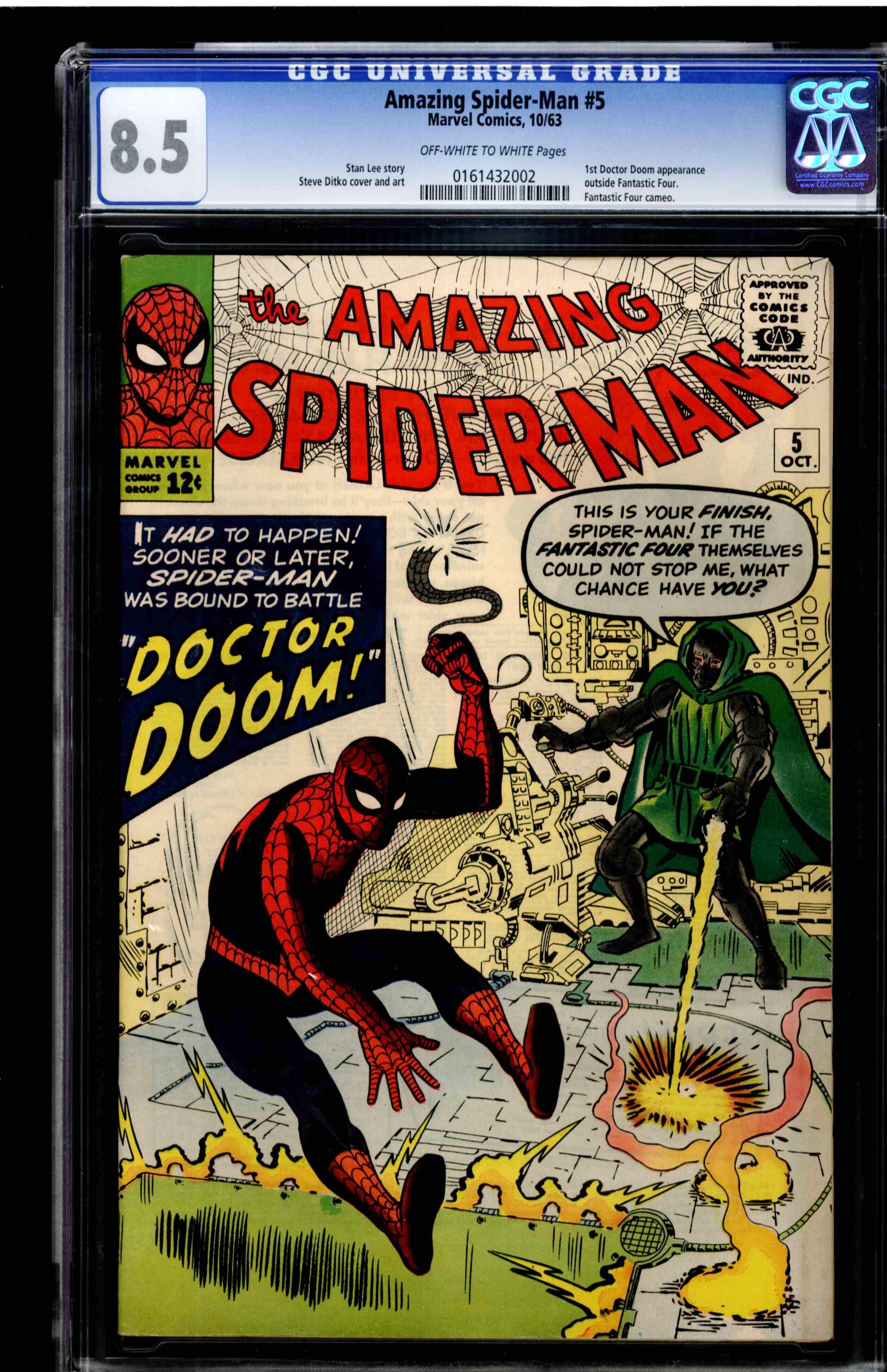Amazing Spider-Man #5 CGC 8.5 off white to white pages. Written by Stan Lee, art by Steve Ditko. Crossover with Fantastic Four Villain Dr. Doom. Doom doesn't want the Fantastic Four! Doom wants pictures! Pictures of Spider Man! October 1963. Overstreet 2009 VF 8.0 value = 1,750; VF/NM 9.0 value = $3,375. The CGC universal census reports 18 at 8.5, 21 at 9.0, 13 at 9.2, 8 at 9.4, 6 at 9.6.