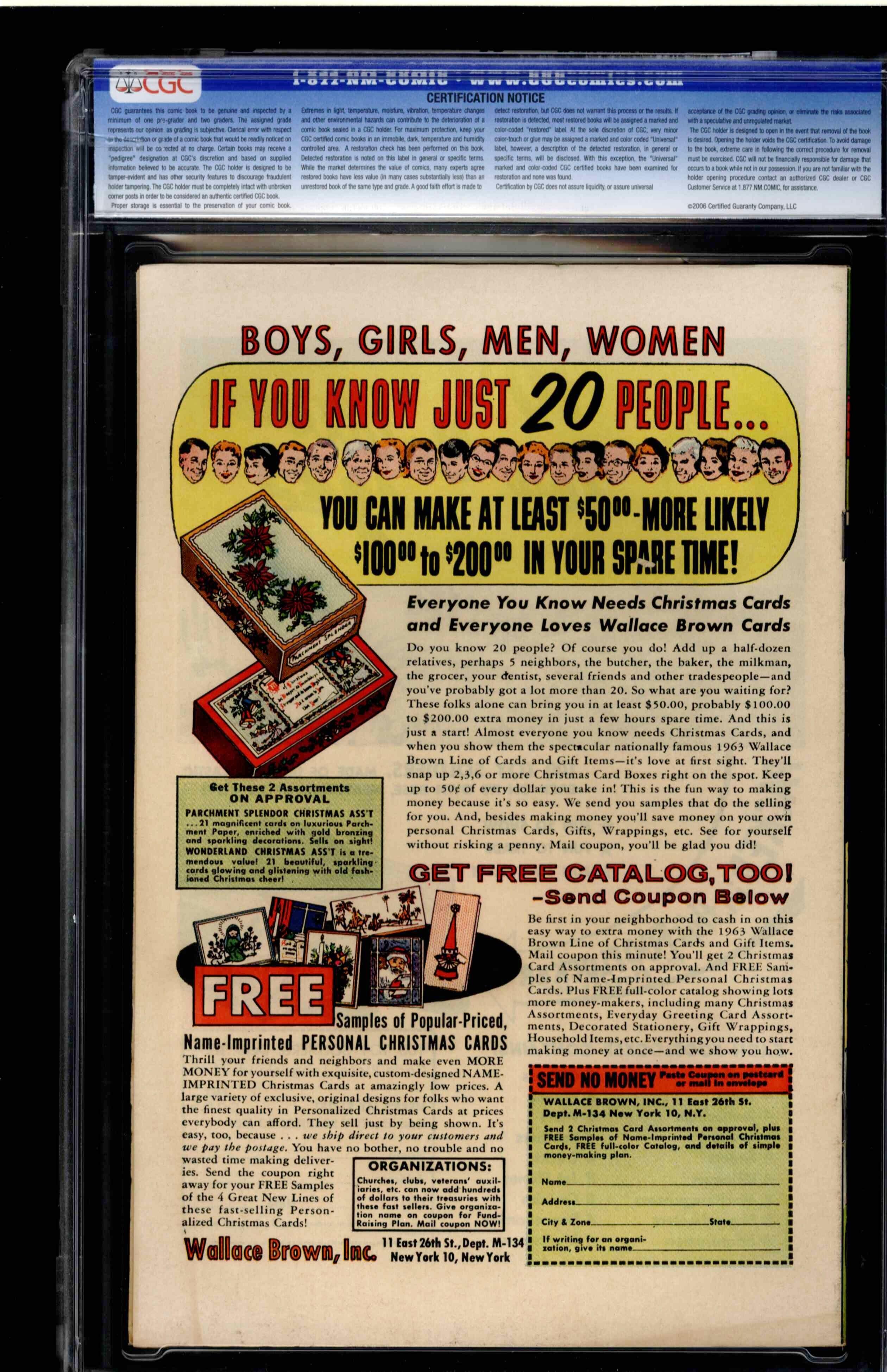 The Auctioneer has reserved the right to reject any and all bids, and to bid at the auction. Auctioneers Auctions are not on approval. Auctioneer does not allow certified material to be returned because of possible differences of opinion with respect to the grade offered by any third party organization, dealer, or service. Absolutely no guarantee of grade is offered for un-certified property sold and subsequently submitted to a third-party grading service. There will be no exceptions to this policy. Under extremely limited circumstances, (e.g. gross cataloging error) a purchaser, who did not bid from the floor, may request Auctioneer to evaluate voiding a sale; such request must be made in writing detailing the alleged gross error, and submission of the lot to the Auctioneer must be pre-approved by the Auctioneer. Bidder must notify Auctioneer in writing of such request within three (3) days of the non-floor bidder receipt of the lot. Any lot that is to be evaluated must be in our offices within 30 days after Auction. Grading does not qualify for this evaluation process nor do such complaints constitute a basis to challenge the authenticity of a lot. AFTER THAT 30-DAY PERIOD, NO LOTS MAY BE RETURNED FOR REASONS OTHER THAN AUTHENTICITY. Lots returned must be housed intact in the original holder. No lots purchased by floor Bidders may be returned (including those Bidders acting as agents for others). Late remittance for purchases may be considered just cause to revoke all return privileges. B: Auctions conducted solely on the Internet have a THREE (3) DAY RETURN POLICY: Lots paid for within seven days of the Auction closing are sold with a three (3) day return privilege. You may return lots under the following conditions: Within three days of receipt of the lot, you must first notify Auctioneer by contacting Client Service by phone (314-680-8599) or e-mail (moundcityauctions@gmail.com), and immediately mail the lot(s) fully insured to the attention of Returns, Mound City Auctions 1081 Teson Rd. Hazelwood, MO. 63042. Lots must be housed intact in their original holder and in their original condition. You are responsible for the insured, safe delivery of any lots. Auctioneer will not be responsible for lots returned in non-registered mail or lots returned without prior authorization per section B. A non-negotiable return fee of 5% of the purchase price ($10 per lot minimum) will be deducted from the refund for each returned lot or billed directly. Postage and handling fees are not refunded. After the three-day period (from receipt), no items may be returned for any reason. Late remittance for purchases revokes all Return-Restock privileges. C: Bidders who have inspected the lots prior to the auction will not be granted any return privileges. D: Comic books sold referencing a third-party grading service are sold “as is” without any express or implied warranty. Certain warranties may be available from the grading services and the Bidder is referred to them for further details: Certified Guaranty Company, LLC. (CGC), P.O. Box 4738, Sarasota, FL 34230. E: Bidders who intend to challenge authenticity or provenance of a lot must notify Auctioneer in writing within thirty (30) days of the Auctions conclusion. In the event Auctioneer cannot deliver the lot or subsequently it is established that the lot lacks title, provenance, authenticity, or other transfer or condition issue is claimed, Auctioneer's liability shall be limited to rescission of sale and refund of purchase price; in no case shall Auctioneer's maximum liability exceed the high bid on that lot, which bid shall be deemed for all purposes the value of the lot. After one year has elapsed, Auctioneer's maximum liability shall be limited to any commissions and fees Auctioneer earned on that lot. F: All comics are guaranteed genuine, but are not guaranteed as to grade, since grading is a matter of opinion, an art and not a science, and therefore the opinion rendered by the Auctioneer or any third party grading service may not agree with the opinion of others (including trained experts), and the same expert may not grade the same item with the same grade at two different times. G: Since we cannot examine encapsulated comics, they are sold “as is”without our grading opinion, and may not be returned for any reason. Auctioneer shall not be liable for any patent or latent defect or controversy pertaining to or arising from any encapsulated collectible. In any such instance, purchaser's remedy, if any, shall be solely against the service certifying the collectible. H: Due to changing grading standards over time, differing interpretations, and to possible mishandling of items by subsequent owners, Auctioneer reserves the right to grade items differently than shown on certificates from any grading service that accompany the items. Auctioneer also reserves the right to grade items differently than the grades shown in the prior catalog should such items be reconsigned to any future auction. I: Although consensus grading is employed by most grading services, it should be noted as aforesaid that grading is not an exact science. In fact, it is entirely possible that if a lot is broken out of a plastic holder and resubmitted to another grading service or even to the same service, the lot could come back with a different grade assigned. J: Certification does not guarantee protection against the normal risks associated with potentially volatile markets. The degree of liquidity for certified collectibles will vary according to general market conditions and the particular lot involved. For some lots there may be no active market at all at certain points in time."