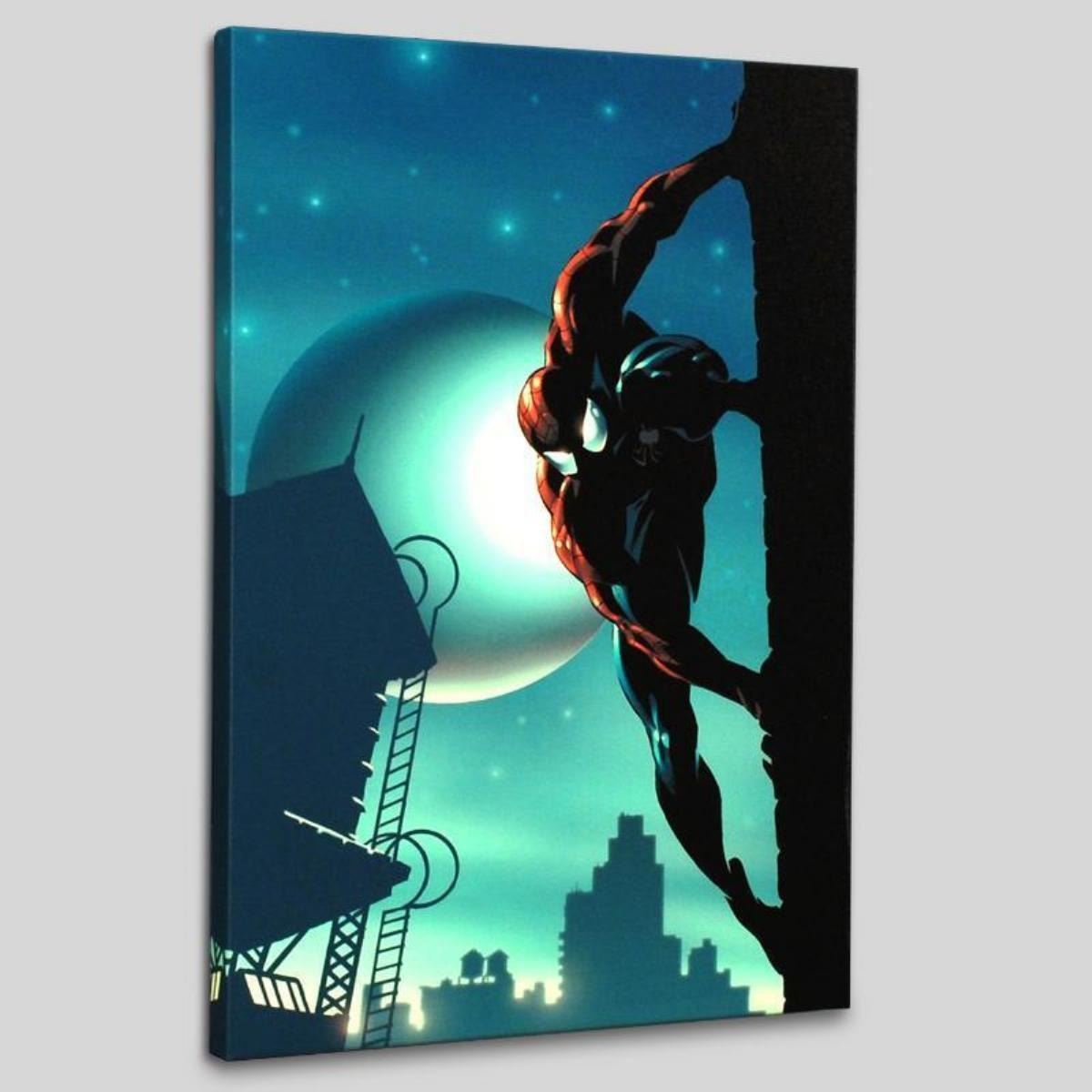 A piece of comic book history, this limited edition, from original art by Mike Deodato Jr., depicts Spider-Man keeping vigil over the city at night. Brazilian artist Mike Deodato Jr. has become an enduring fan favorite, working in styles ranging from wildly energetic cartooning to moody photorealism. Deodato became one of the decade's most prolific and in-demand artists, including Marvel credits such as Avengers, Elektra, Incredible Hulk, Spider-Man and Thor. "Amazing Spider-Man #521" is a limited edition numbered giclee on canvas by Mike Deodato Jr. presented by Marvel Comics. This piece comes gallery wrapped. Includes Certificate of Authenticity! Measures approx. 18" x 27" (image); 1.5" (depth).