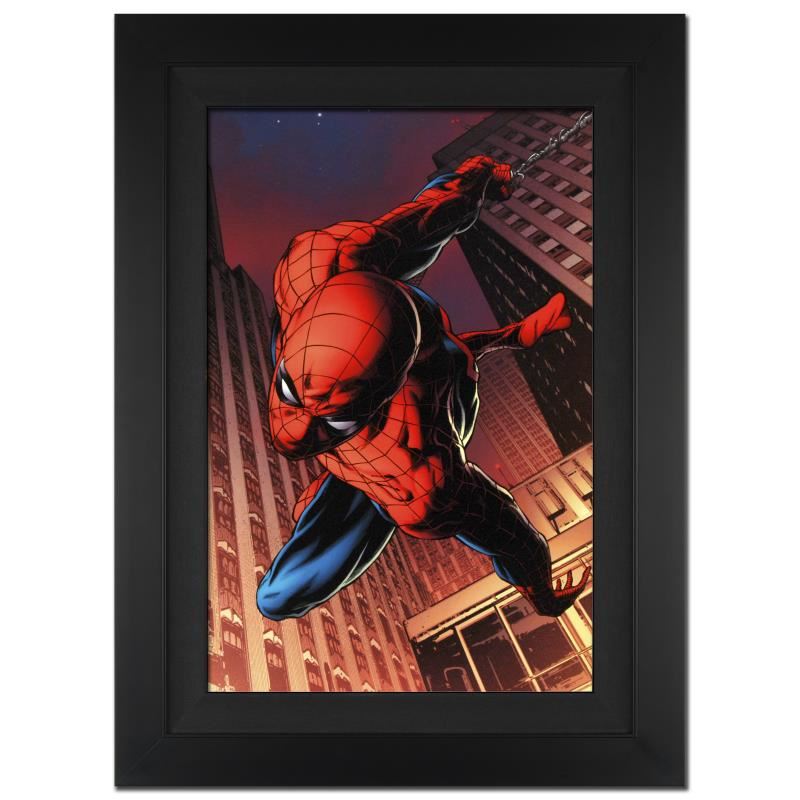 A piece of comic book history, this limited edition, from original art by Joe Quesada, depicts the heroic Spider-Man. Joe Quesada gained renown in the comic book industry by drawing several Valiant Comics titles. In 1998, Quesada started a series for Marvel called Marvel Knights, the success of which launched him into the editor-in-chief seat and then Chief Creative Officer in 2010. "Amazing Spider-Man #641" is an extremely limited edition giclee on canvas by Joe Quesada presented by Marvel Comics, hand signed by the Great Stan Lee (1922-2018) and numbered out of only 4! This piece comes custom framed and ready to hang. Includes Certificate of Authenticity! Measures approx. 29" x 40" (with frame); 22" x 33" (image).
