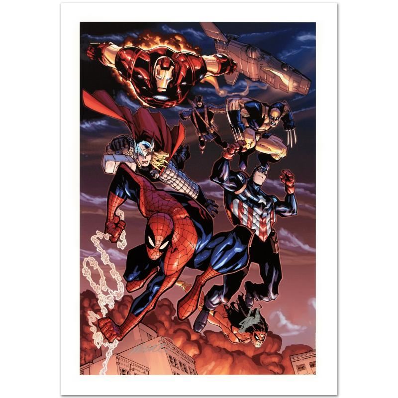 A piece of comic book history, this limited edition, from original art by Humberto Ramos, depicts the classic characters Spider-Man, Captain America, and Iron Man, among others. Mexican comic book artist Humberto Ramos is best known for his work on Impulse, The Spectacular Spider-Man, and The Amazing Spider-Man. Ramos also created his own horror fantasy comic book series, Crimson. "The Amazing Spider-Man #648" a limited edition giclee on canvas by Humberto Ramos presented by Marvel Comics, numbered and hand signed by Humberto Ramos and the great Stan Lee! Includes Certificate of Authenticity! Measures approx. 18" x 27" (image).