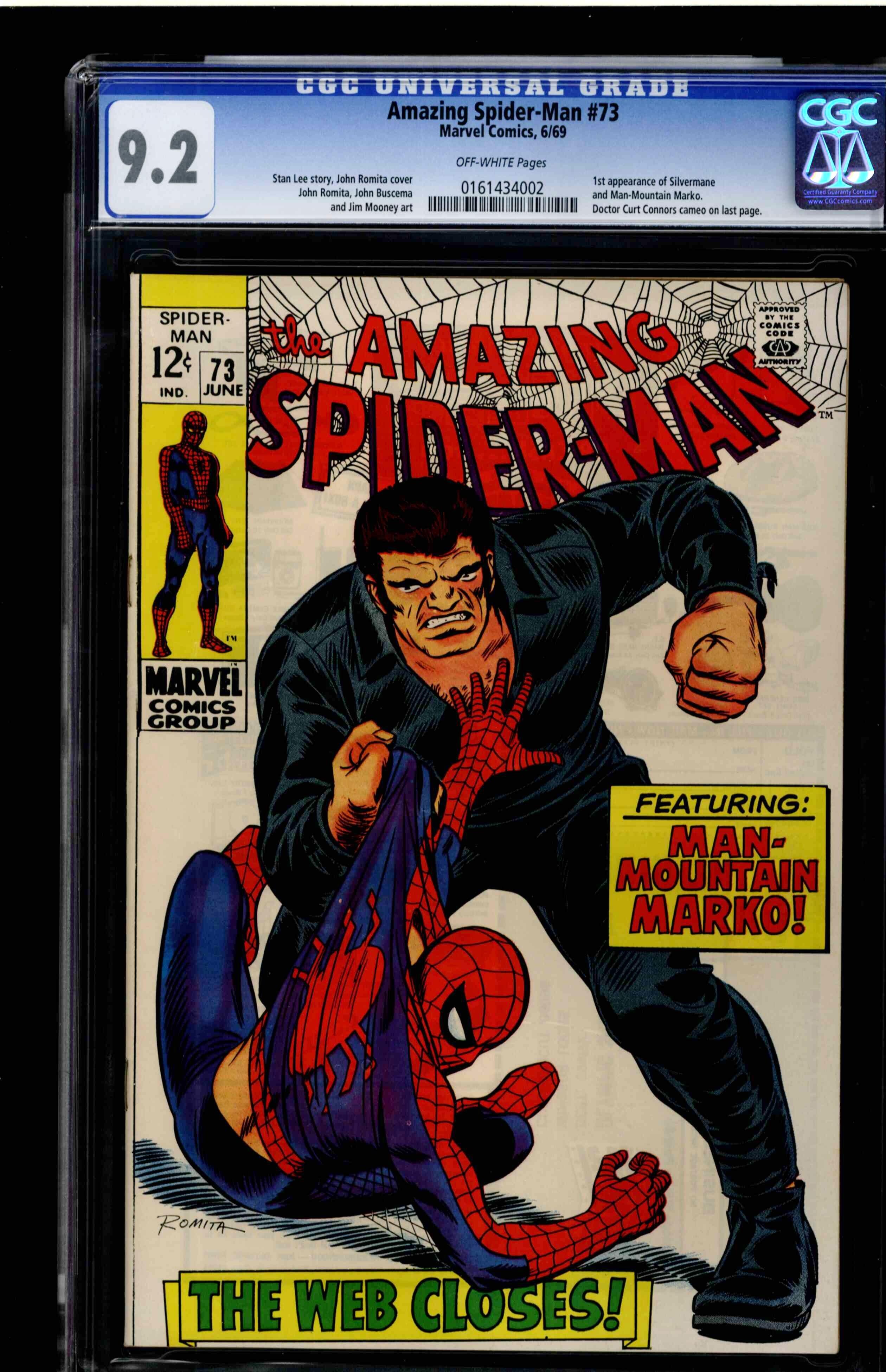 Amazing Spider-Man #73 CGC 9.2 off-white pages. Stan Lee story, John Romita cover. Romita, Buscema and Mooney art. 1st appearance of Silvermane and Man-Mountain Marko. Doctor Curt Connors cameo on last page. Overstreet 2009 NM 9.2 value = $160. CGC census: 39 at 9.2, 93 higher.