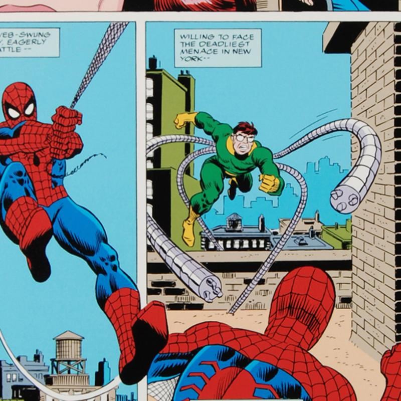 A piece of comic book history, this limited edition, from original art by John Romita Sr., depicts Spider-Man and Dr. Octopus. John Romita becan his career in comics in the 1950's doing freelance work for various organizations. Originally known primarily for his love comic penciling, he soon left this type of comic for a more heroic venture. Romita is known for his work on Dare Devil, Spider-Man, and Captain America. "Amazing Spider-Man #90" is an extremely limited edition giclee on canvas by John Romita Sr. presented by Marvel Comics, hand signed by the great Stan Lee and numbered out of only 10! This piece comes custom framed and ready to hang! Includes Certificate of Authenticity! Measures approx. 25" x 34" (with frame); 18" x 27" (image).