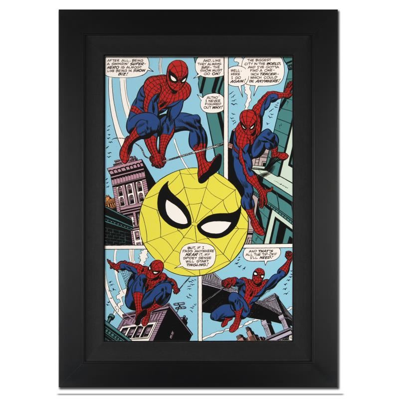 A piece of comic book history, this limited edition, from original art by Gil Kane, depicts a classic comic strip starring Spider-Man. Eli Katz (1926-2000) who worked under the name Gil Kane and in one instance Scott Edward, was a comic book artist whose career spanned the 1940s to 1990s and every major comics company and character. Kane co-created the modern-day versions of the superheroes Green Lantern and the Atom for DC Comics, and co-created Iron Fist with Roy Thomas for Marvel Comics. He was also involved in such major story lines as that of The Amazing Spider-Man. "Amazing Spider-Man #90" is an extremely limited edition giclee on canvas by Gil Kane presented by Marvel Comics, hand signed by the Great Stan Lee (1922-2018) and numbered out of only 4! This piece comes custom framed and ready to hang. Includes Certificate of Authenticity! Measures approx. 29" x 40" (with frame), 22" x 33" (image).