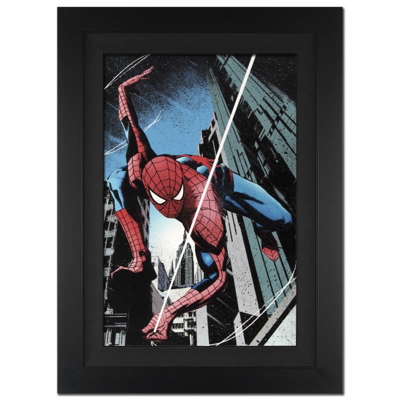 A piece of comic book history, this limited edition, from original art by Tomm Coker, depicts the heroic Spider-Man. Tomm Coker entered the comic book world in the 1990s and has since contributed to many Marvel and DC Comics franchises. "Amazing Spider-Man: Extra #3" is an extremely limited edition giclee on canvas by Tomm Coker presented by Marvel Comics, hand signed by the Great Stan Lee (1922-2018) and numbered out of only 10! This piece is custom framed and ready to hang. Includes Certificate of Authenticity! Measure approx. 25" x 34" (with frame), 18" x 27" (image).