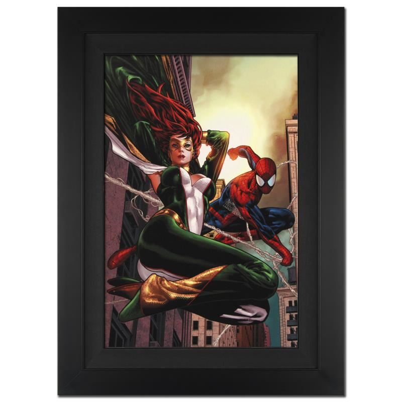 A piece of comic book history, this limited edition, from original art by Paulo Siqueira, depicts Spider-Man and Jackpot. A Brazilian comic book artist, Paulo Siqueira has been drawing for Marvel since the 1990s. He has worked on such titles as Birds of Prey, The Amazing Spider-Man, Ms. Marvel, and Lady Death. "Amazing Spider-Man Family #6" is an extremely limited edition giclee on canvas by Paulo Siqueira presented by Marvel Comics, hand signed by the great Stan Lee and numbered out of only 10! This piece comes custom framed and ready to hang. Includes Certificate of Authenticity! Measures approx. 25" x 34" (with frame), 18" x 27" (image).