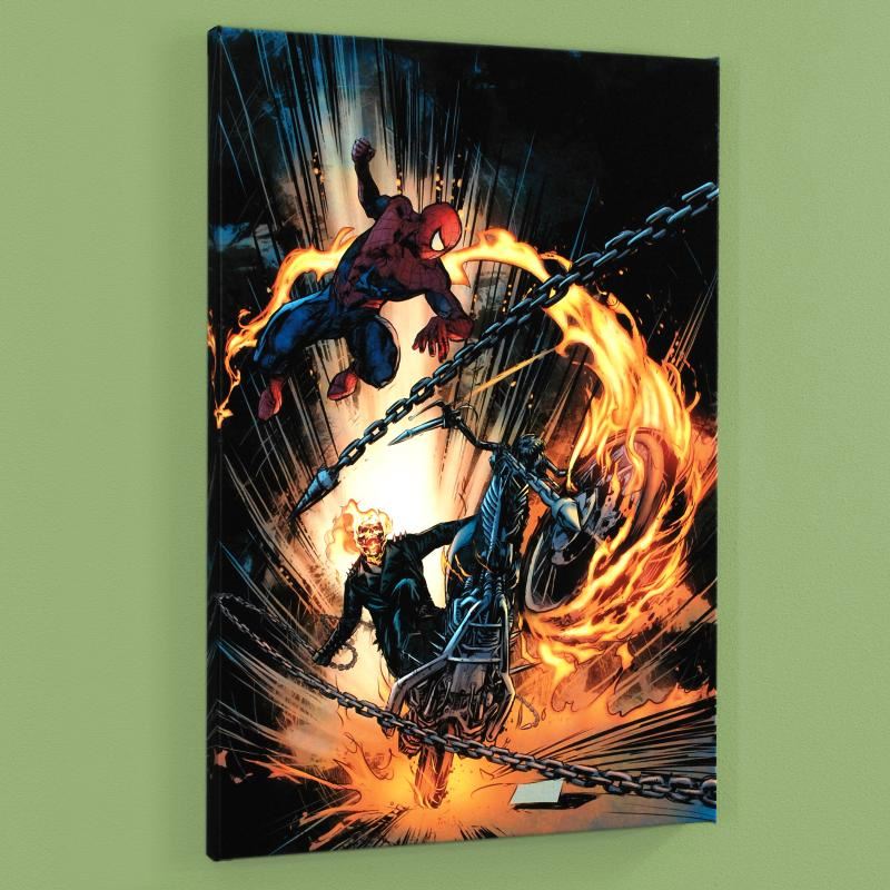 A piece of comic book history, this limited edition, from original art by Roberto De La Torre, depicts an epic battle between two famed comic book icons: The Amazing Spider-Man and Ghost Rider. Since working with Marvel, Roberto De La Torre has worked on some popular comic book series, like Iron Man, Ms. Marvel, and Dare Devil. "Amazing Spider-Man/Ghost Rider: Motorstorm #1" is a limited edition giclee on canvas by Roberto De La Torre presented by Marvel Comics! This piece comes gallery wrapped. Includes Certificate of Authenticity! Measures approx. 18" x 27" (image); 1.5" (depth). Please allow 5 additional business for items that include canvas stretch or framing.