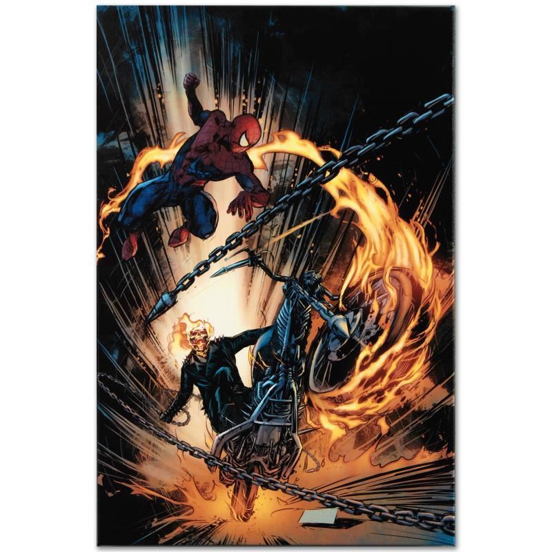 A piece of comic book history, this limited edition, from original art by Roberto De La Torre, depicts an epic battle between two famed comic book icons: The Amazing Spider-Man and Ghost Rider. Since working with Marvel, Roberto De La Torre has worked on some popular comic book series, like Iron Man, Ms. Marvel, and Dare Devil. "Amazing Spider-Man/Ghost Rider: Motorstorm #1" is a limited edition giclee on canvas by Roberto De La Torre presented by Marvel Comics! This piece comes gallery wrapped. Includes Certificate of Authenticity! Measures approx. 18" x 27" (image); 1.5" (depth). This item requires special handling and may have a longer than usual turnaround.
