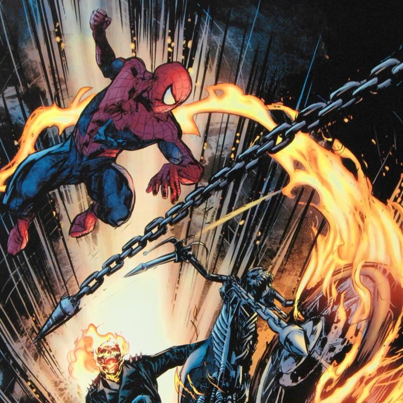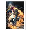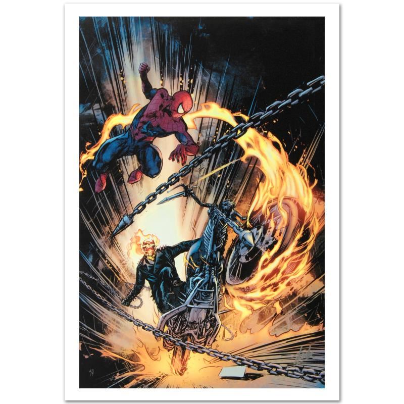 A piece of comic book history, this limited edition, from original art by Roberto De La Torre, depicts an epic battle between two famed comic book icons: The Amazing Spider-Man and Ghost Rider. Since working with Marvel, Roberto De La Torre has worked on some popular comic book series, like Iron Man, Ms. Marvel, and Dare Devil. "Amazing Spider-Man/Ghost Rider: Motorstorm #1" is a limited edition giclee on canvas by Roberto De La Torre presented by Marvel Comics, numbered and hand signed by the great Stan Lee! Includes Certificate of Authenticity! Measures approx. 18" x 27" (image).