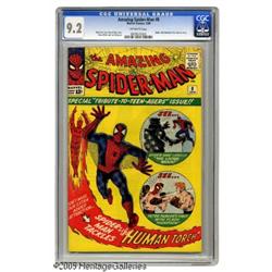 <B>Amazing Spider-Man, The #8 (Marvel, 1964) CGC NM- 9.2 Off-white pages.</B></I> Peter Parker gets to live out every bookworm's fantasy, having a boxing match with the resident school bully, Flash Thompson. Then the fists start flying, a robot interrupts the bout, and things <I>really</B></I> get crazy in this story drawn by Steve Ditko. The backup feature's a winner as well -- it has Ditko and Jack Kirby collaborating on a story guest-starring the Fantastic Four. Overstreet 2004 NM- 9.2 value = $1,750. CGC census 12/04: 19 in 9.2, 26 higher.