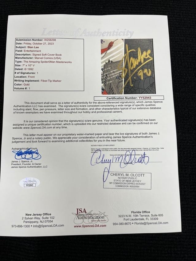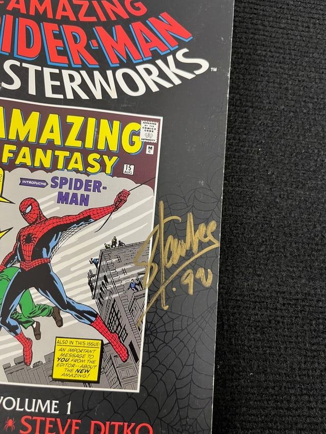 Up for auction is the Amazing Spider-man Masterworks TPB featuring Spider-man's 1st issues signed by Stan Lee in Gold Sharpie. This item comes with a complete JSA Letter of Authentication! Please look at the pictures carefully to determine what you believe the condition of collecitible is. We are currently accepting consignments. Email us a aeronhouse1994@gmail.com or visit our website, www.ahauctionhouse.com. We are currently seeking Star Wars related Collectibles to consign.
