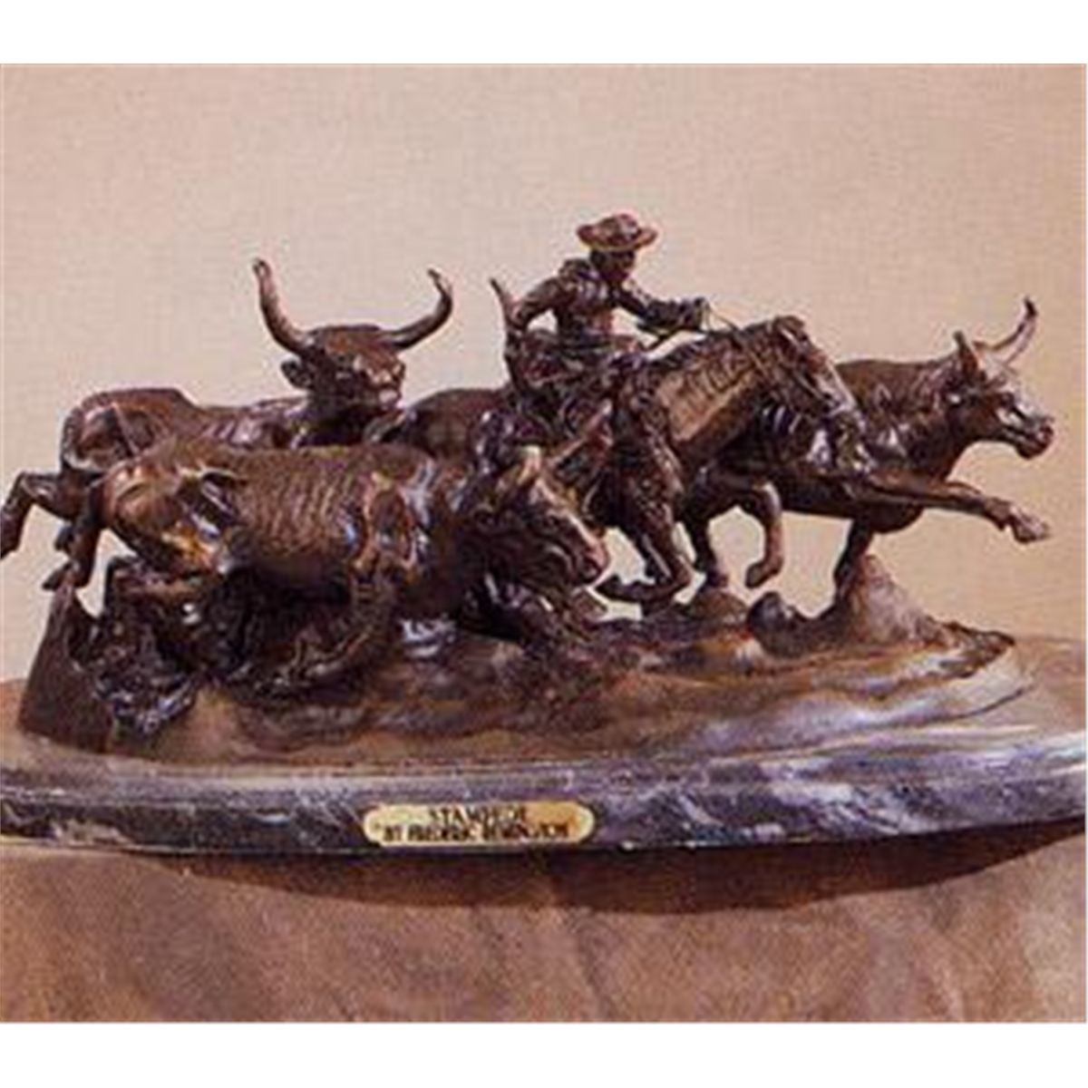 Amazing "Stampede" Bronze Sculpture by Frederick Remington, 4 cattle, one cowboy on horse, pure bronze. 18"L x 11"W x 10"H.