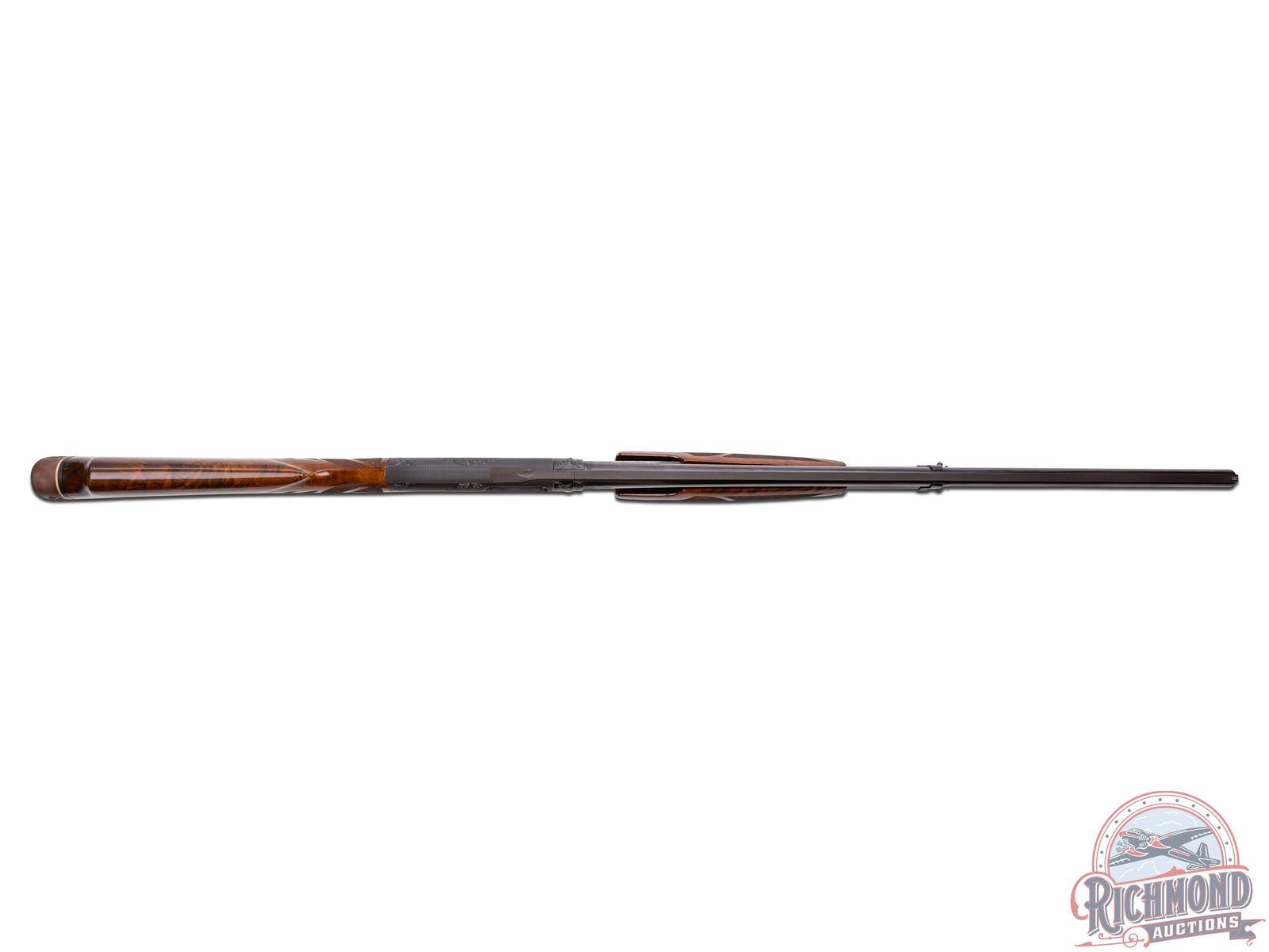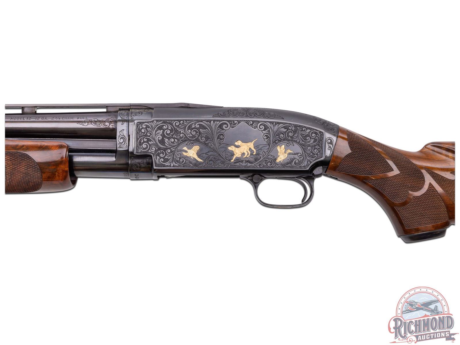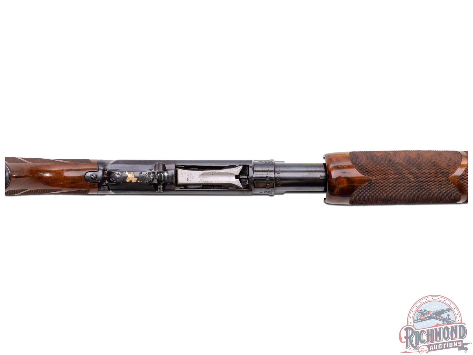 Manufactured in 1949. This beautiful shotgun features a 30" blued ventilated rib barrel with white bead front sight. Chambered for 2-3/4" shells with Full choke. Engraved floral scroll pattern on both sides of the barrel extends 1-1/2" from the action. Matching serial numbers on barrel and receiver. Both sides feature a triple game scene with two gold inlaid dogs in a field scene in the center, with a gold inlaid pheasant to the front and gold inlaid duck in flight to the rear, all surrounded by a floral scroll design. Signed "N.Hartliep" on the left side below the pheasant. Top of the matte finished receiver features matching floral scroll designs with punch dot background on each side. Gold inlaid game bird in flight on the bottom of the trigger guard and magazine band with floral scroll. Nice feather crotch walnut pistol grip stock with checkering on grip and fitted with a blued metal cap. Matching forearm with checkering. Fitted with a brown ventilated recoil pad. LOP: 14-1/2". DAC: 1-1/2". DAH: 2-1/4". CALIBER: 12 GA. S/N: 1247690. FFL STATUS: Curio & Relic.