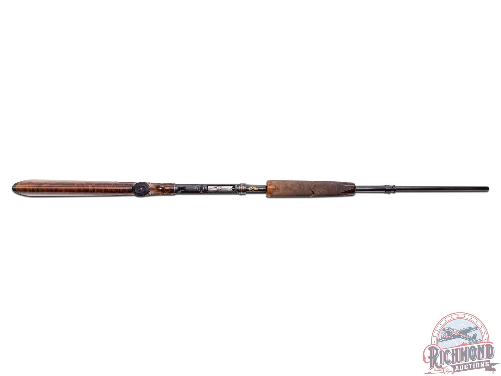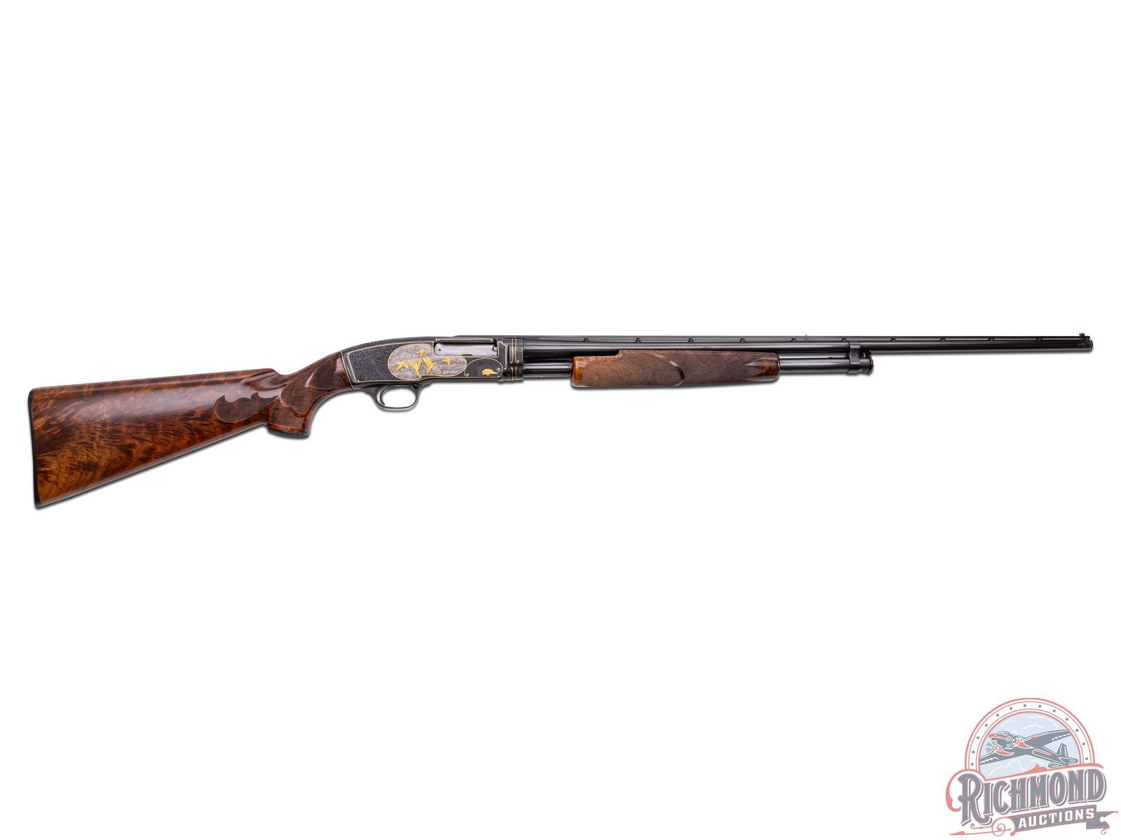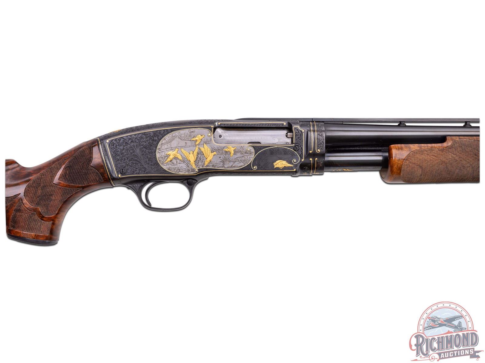 Manufactured in 1950. This beautiful shotgun features a 28" blued ventilated rib barrel with a nickel bead mid-barrel and red dot front sight. Chambered for 3" shells with Full choke. Engraved scroll pattern extends from the gold lined muzzle 1" on each side. Gold lettering on the barrel "WINCHESTER - MODEL 42 - 410 - 3IN. CHAM. - FULL". Gold inlaid Pigeon on the bottom of the barrel with gold matching serial numbers on barrel and receiver. Floral scroll design engraved on the barrel sleeve with gold lined border. Blued and coin finished receiver features 95% engraved coverage by Master engraver Angelo Bee. Left side features a coin finish scene of five gold inlaid game birds in flight in a field next to a farmhouse, surrounded by a gold line border. Left side forward features three gold inlaid game birds in a field also surrounded by a gold line border. The remainder is covered in a beautiful floral scroll design. Signed "A.BEE" just above the crossbolt safety. Right side features a similar design in a coin finish scene of five gold inlaid game birds in flight in a field next to a farmhouse, surrounded by a gold line border. Right side forward features two gold inlaid game birds in a field also surrounded by a gold line border. The remainder is covered in a beautiful floral scroll design. The top of the receiver features a gold inlaid woodcock in flight surrounded by a floral scroll design and a gold lined border as well. Nicely figured feather crotch walnut pistol grip stock with checkering on grip and fitted with a Winchester cap. Matching forearm with checkering. Fitted with a black Winchester logo checkered butt plate. LOP: 14". DAC: 1-1/2". DAH: 2-1/4". CALIBER: 410. S/N: 93739. FFL STATUS: Curio & Relic.