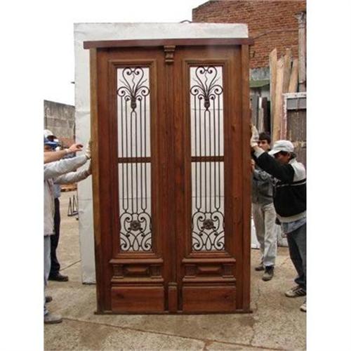 Double door made in solid mahogany, with wrought iron insert, this door is full restore, coming with frame and hinges ( pre-hung), and some finish, You will need just ad glasses and hardware, all the holes was cover, so you can drill new holes for your hardware. Also I recommend ad 2 coat of varnish.