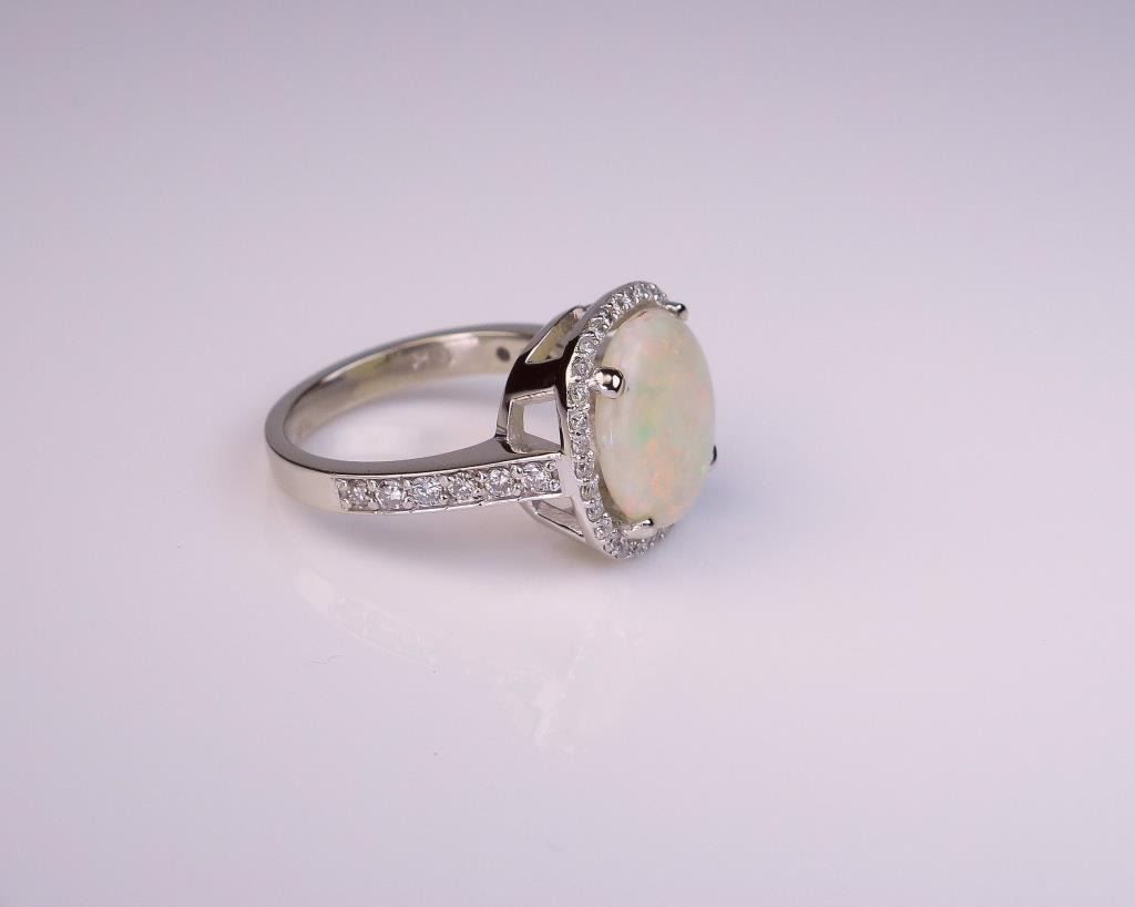 opal weighing approx. 4.00 carats and surrounded by 46 fine cut diamonds weighing approx. 0.80-1.00 carat of F-G colors and VS/SI clarity set in a 14 karat white gold custom made setting. Retail $4,000-$6,000 Estimates $2,500-$3,500