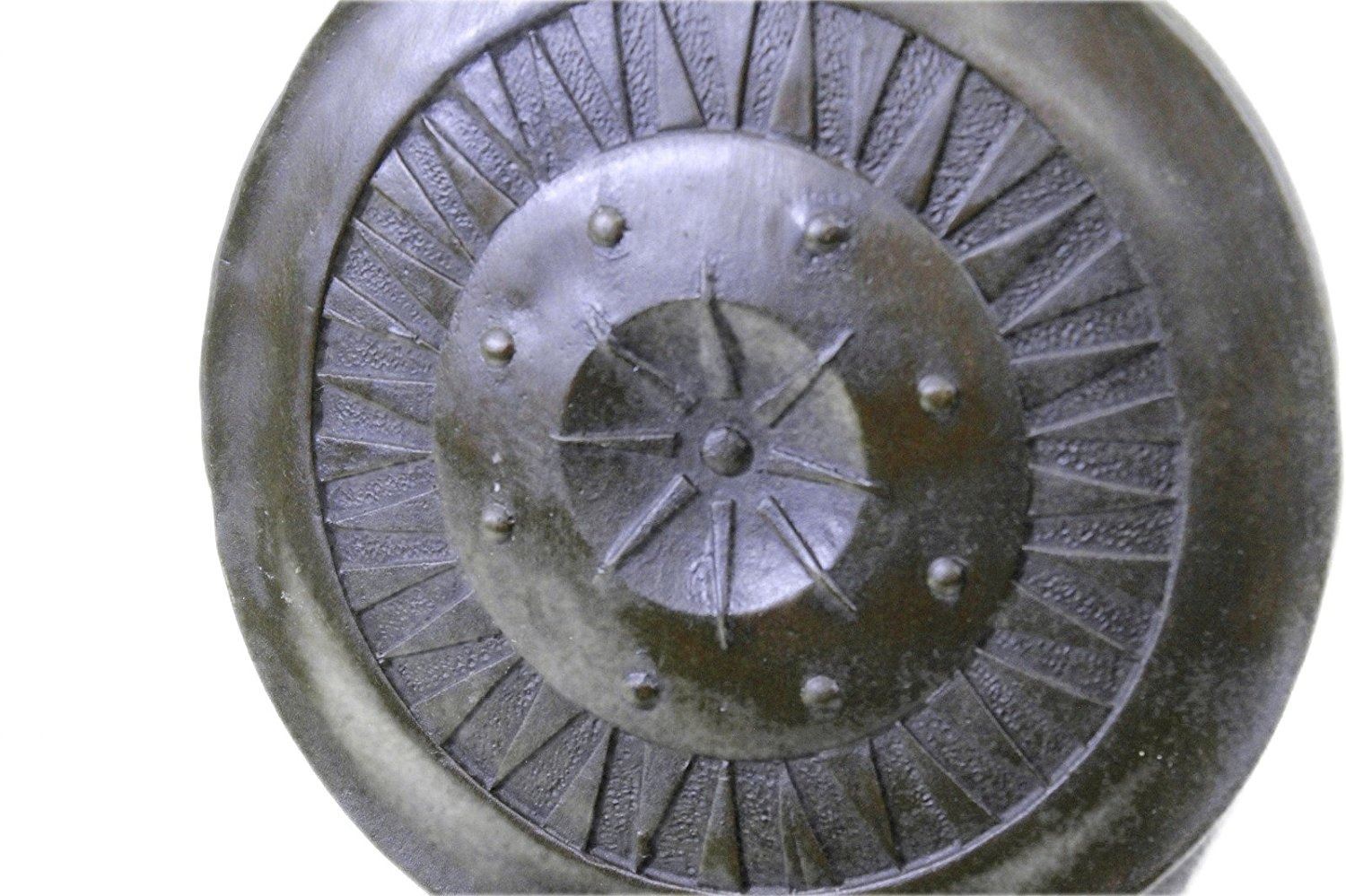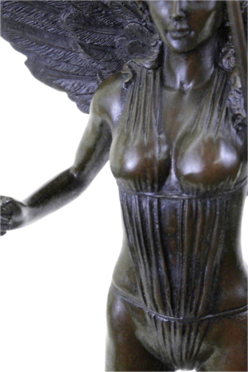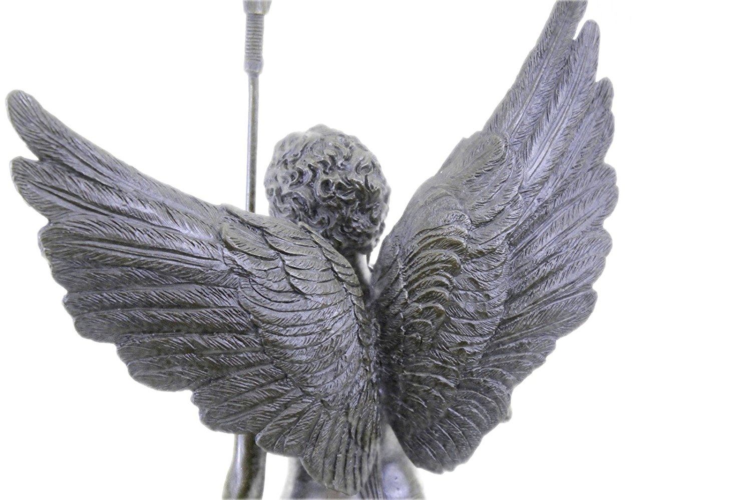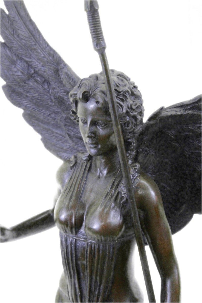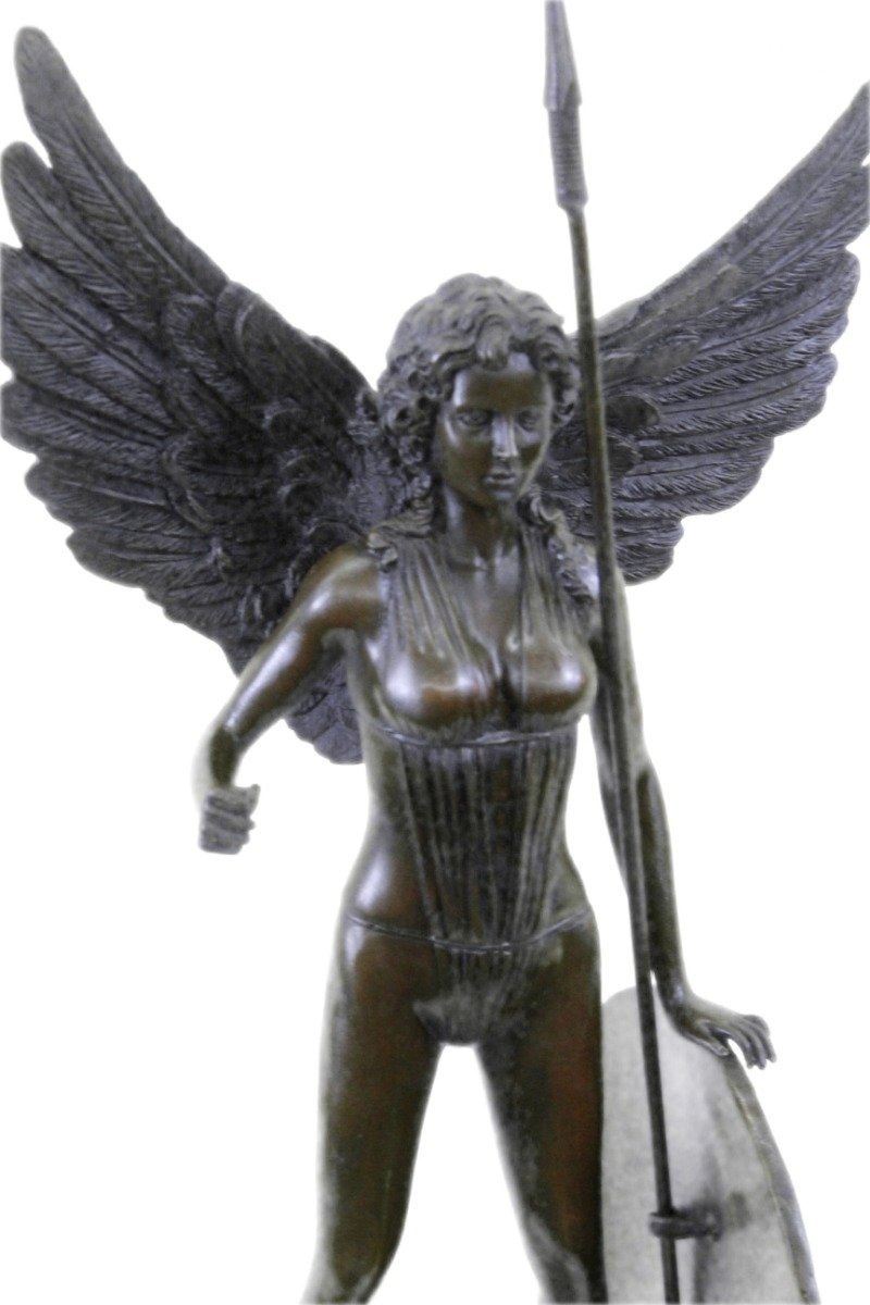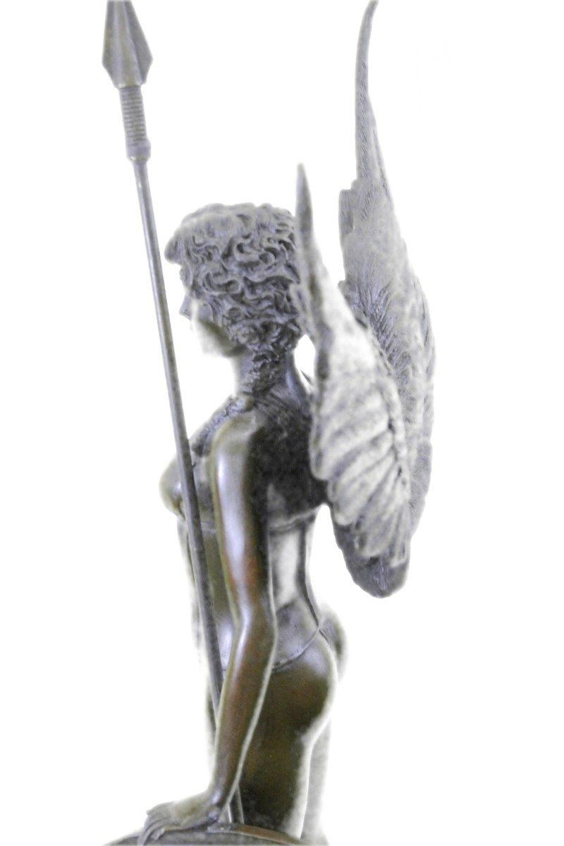 An Amazon warrior stands boldly, staring her enemy in the eye. She comes from a supernatural world and fights the immortal creatures that ravage it. She is armed with a tall spear and shield. Her spear is planted on the ground beside her, while she rests a hand on her shield. She wears a suit that clings to her curves. Her wings extend behind her.100% bronze and handmade, this brown patina sculpture was cast using the Lost Wax Method and mounted on a marble base. Bronze Dimensions with Marble Base: Height 21 X Width 10 inches. Weight: 20 LBS. Inventory: 44DS2256544