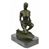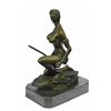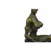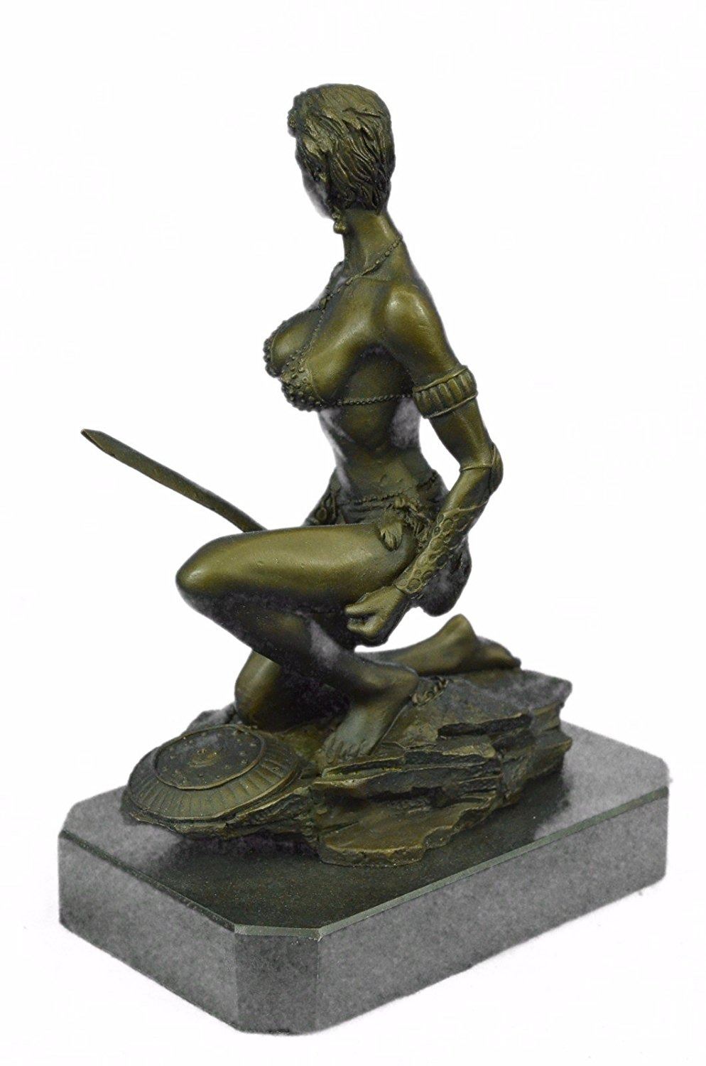 A sexy and tough Amazon warrior sits proudly holding her sword. Her other arm is tense, highlighting her sculpted arms. Her large breasts are dressed in a studded bikini. She is a fighter in the wild. Her headband and shield bear the same wild beast that is her symbol. The sculpture was created using the lost wax method. It rests on a black marble base. Bronze Dimensions with Marble Base: Height 9 X Width 6 inches. Weight: 8 LBS. Inventory: 47Y6623474