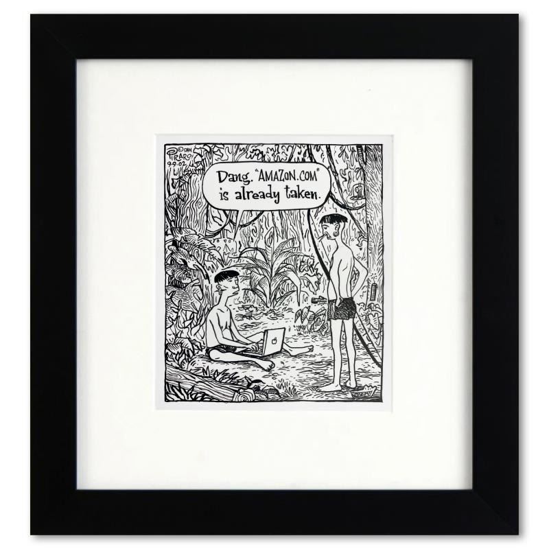 Amazon Website by Bizarro Original. Please see photos and description for all available information. Enter a surreal and satirical world of twisted imagination and award winning creativity. "Amazon Website" is an original pen & ink drawing on paper by Dan Piraro, creator of the critically acclaimed and award winning comic strip, Bizarro. This piece is hand signed, comes custom framed and includes a letter of authenticity. Measures approximately 12" x 11" (frame), 7" x 6" (image).This item requires special handling and may have a longer than usual turnaround.