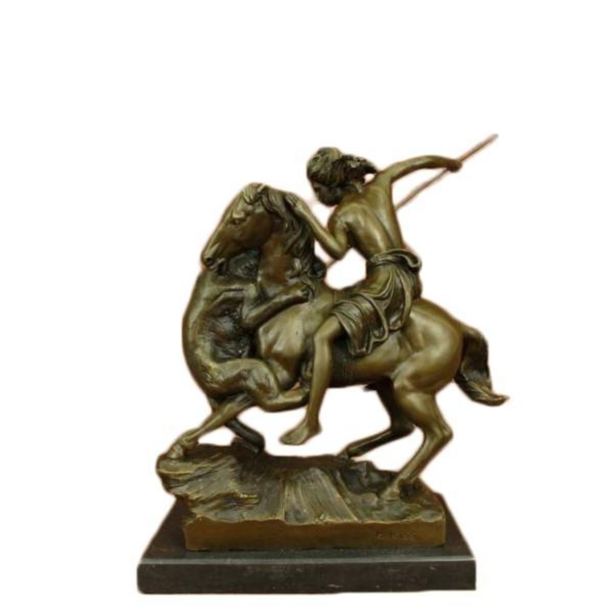 After August Karl Edouard Kiss ( German, 1802 - 1865 ) Amazon on Horseback Attacked  by a Tiger without Spear. BUYER BEWARE: The spear seems to have been lost for this particular bronze. Lost wax casting method bronze, with brown patina, mounted on a marble base. 15" X 21". 23lbs.