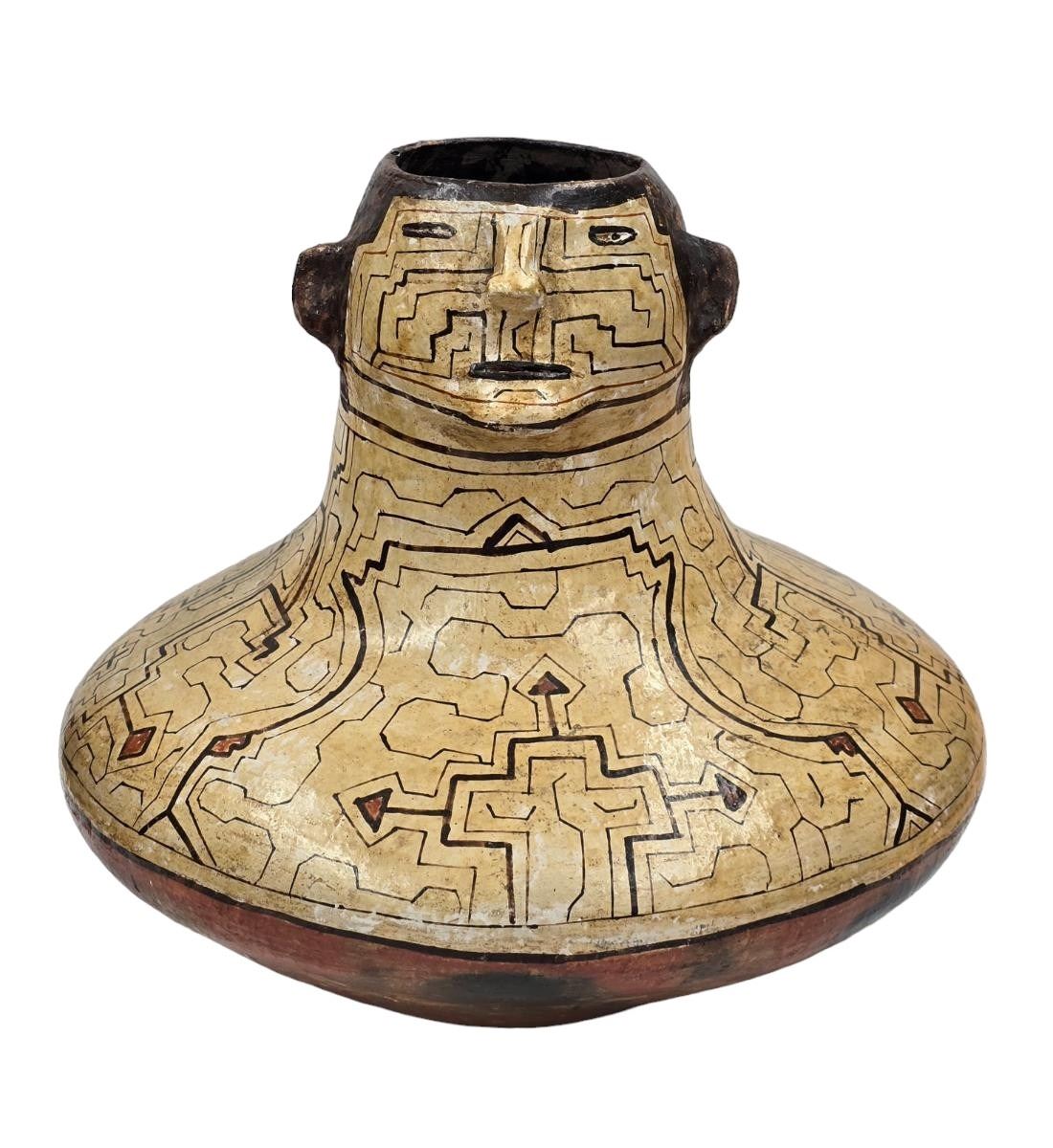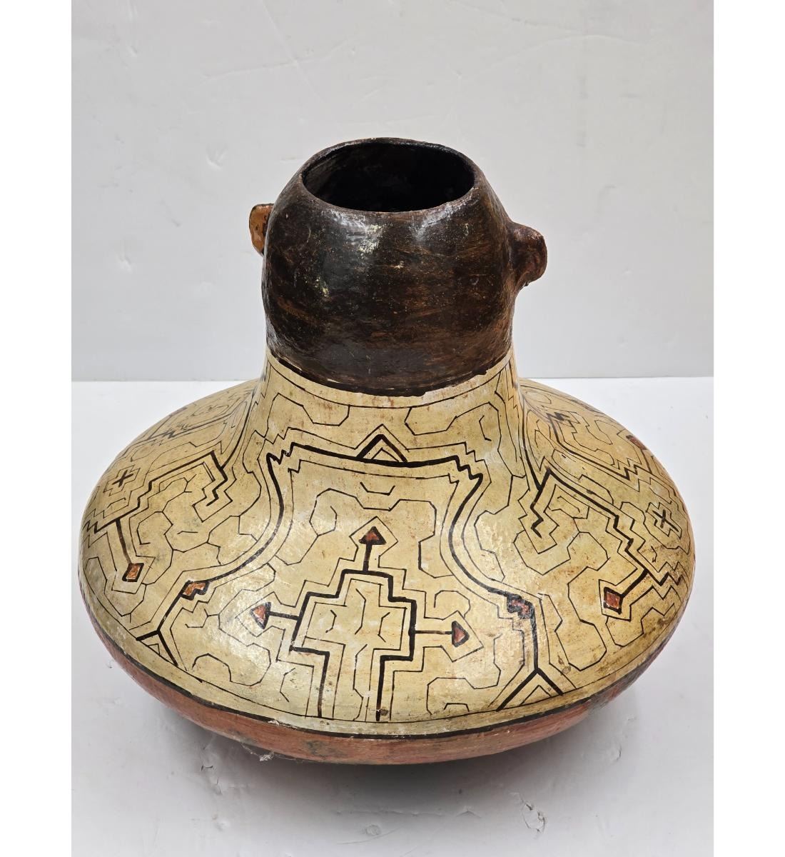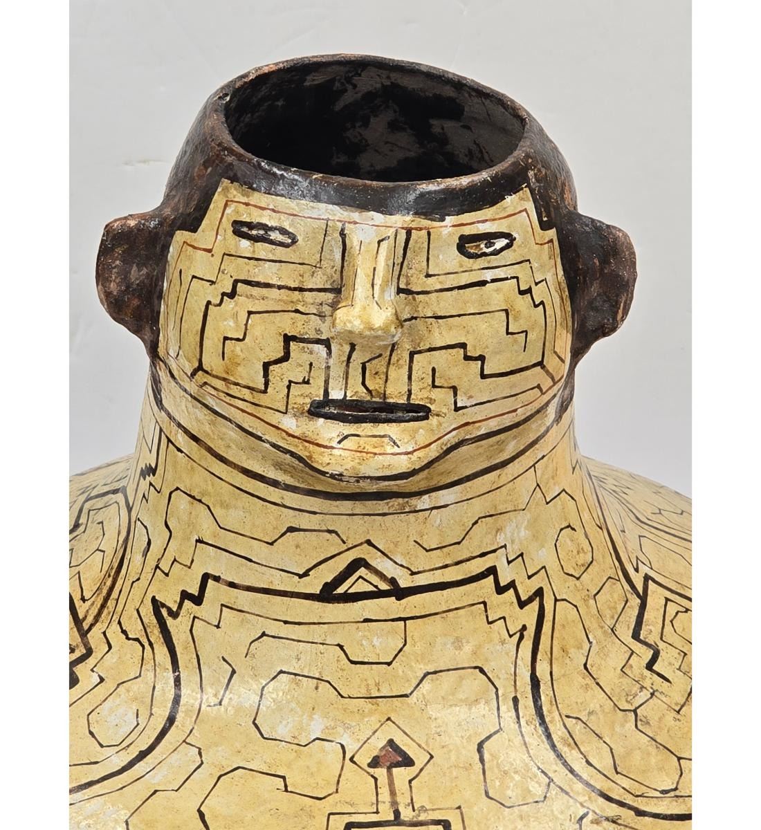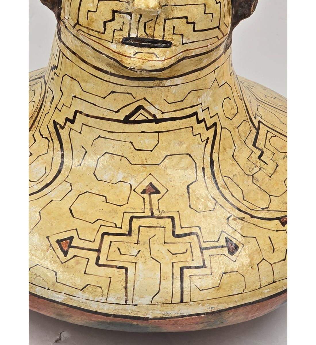 A Fine And Older, Hand Thrown Polychromed Painted, Ceramic Anthropomorphic Shapibo From Amazonian Rain Forest. Measure 10.5" x 11.5". Provenance: One Person Private Estate Central Florida.