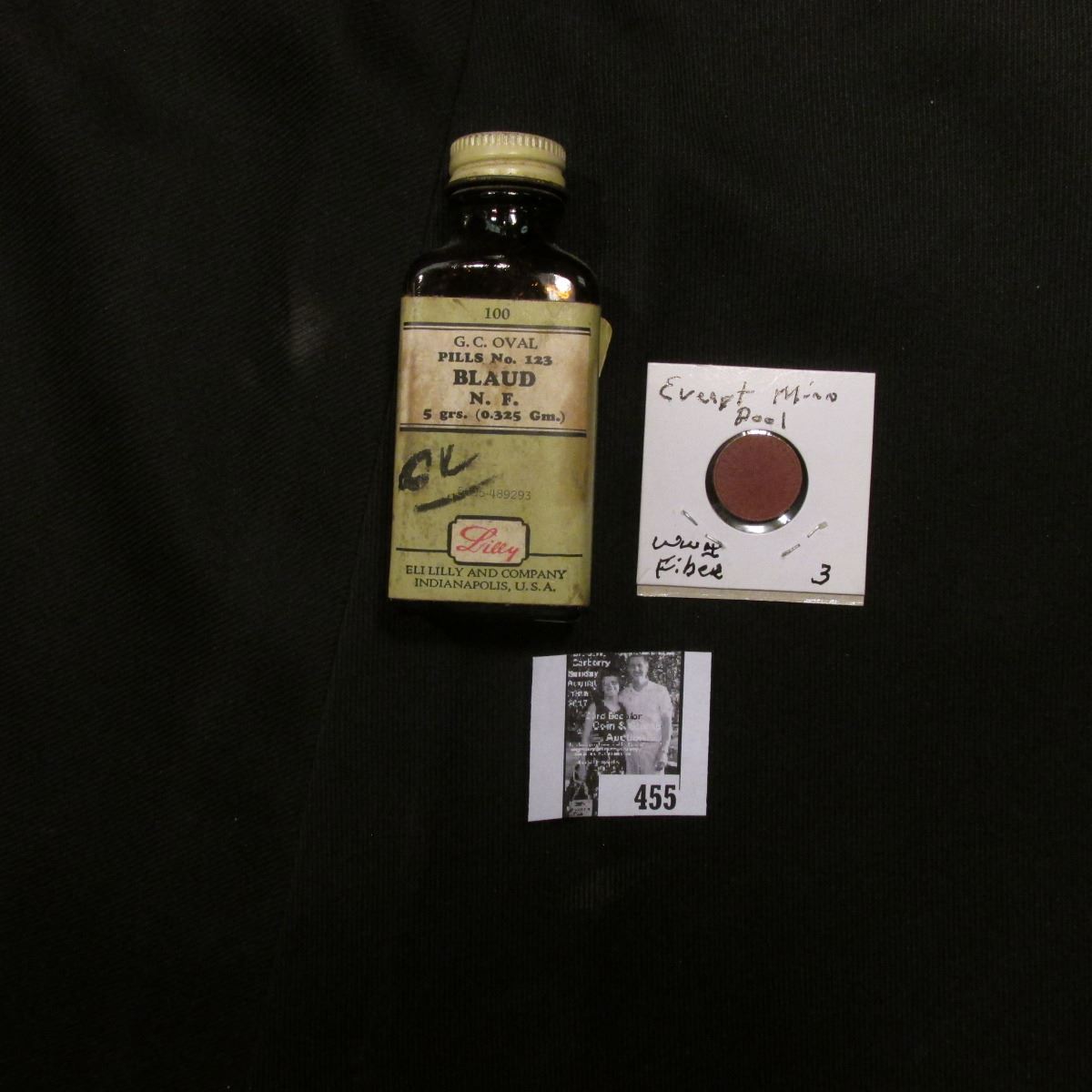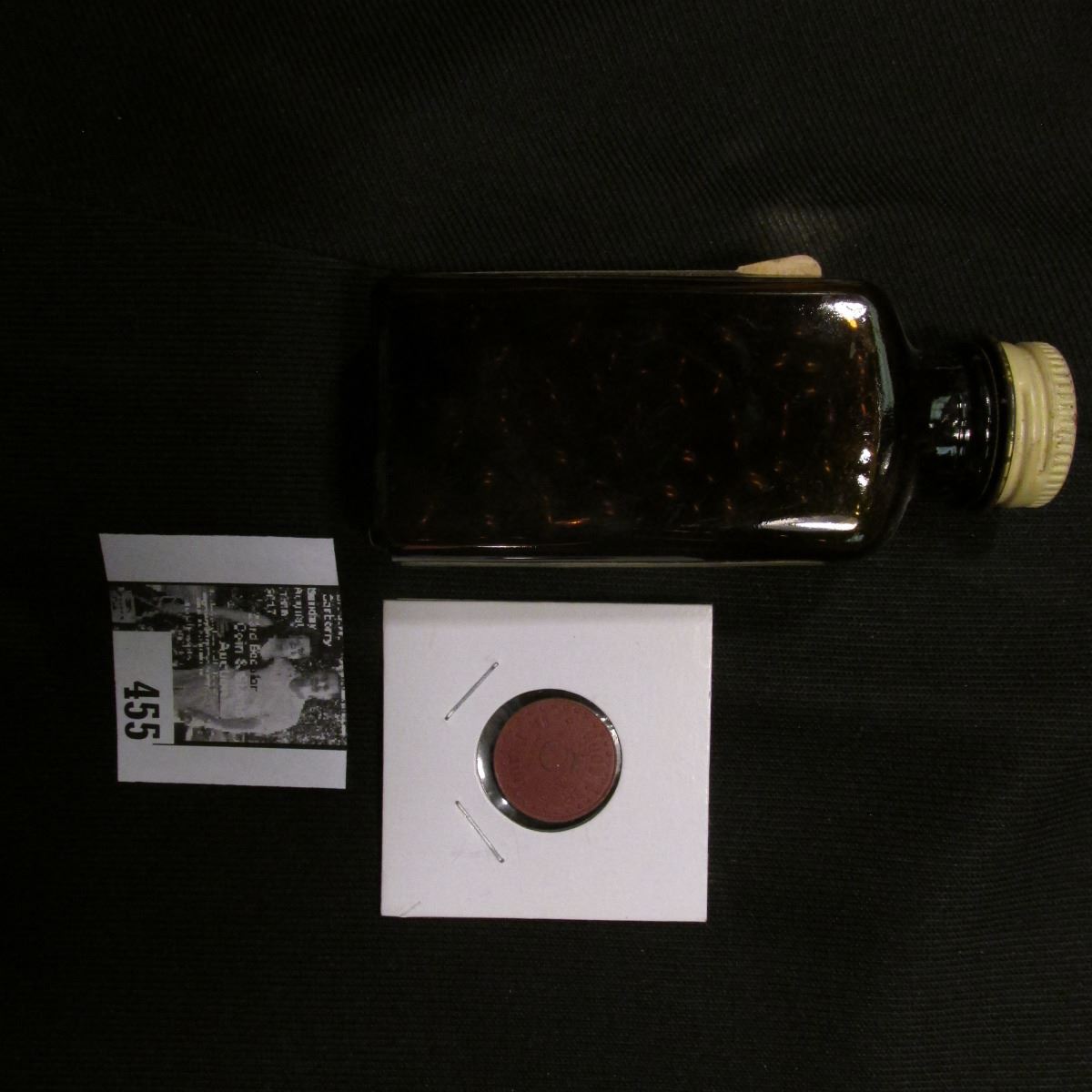 Amber Bottle with screw top "Blaud" pills, a pill consisting essentially of ferrous carbonate used in the treatment of anemia, by Lilly Drug Co.; & "Hinz Pool/Hall/Amiret,/Minn.", "Good For/5c/In Trade", red fiber token from the World War II era.