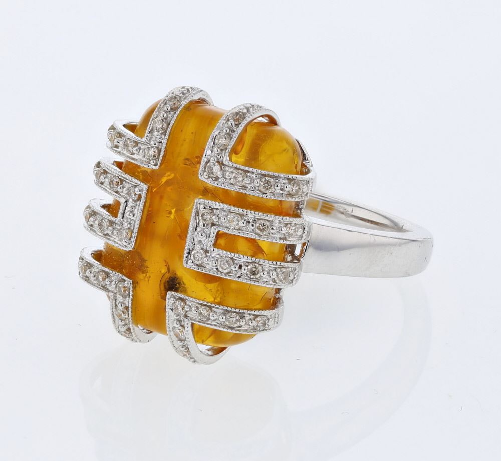 Amber Cabochon Ring w/ Channel-set Diamonds in 14K White Gold